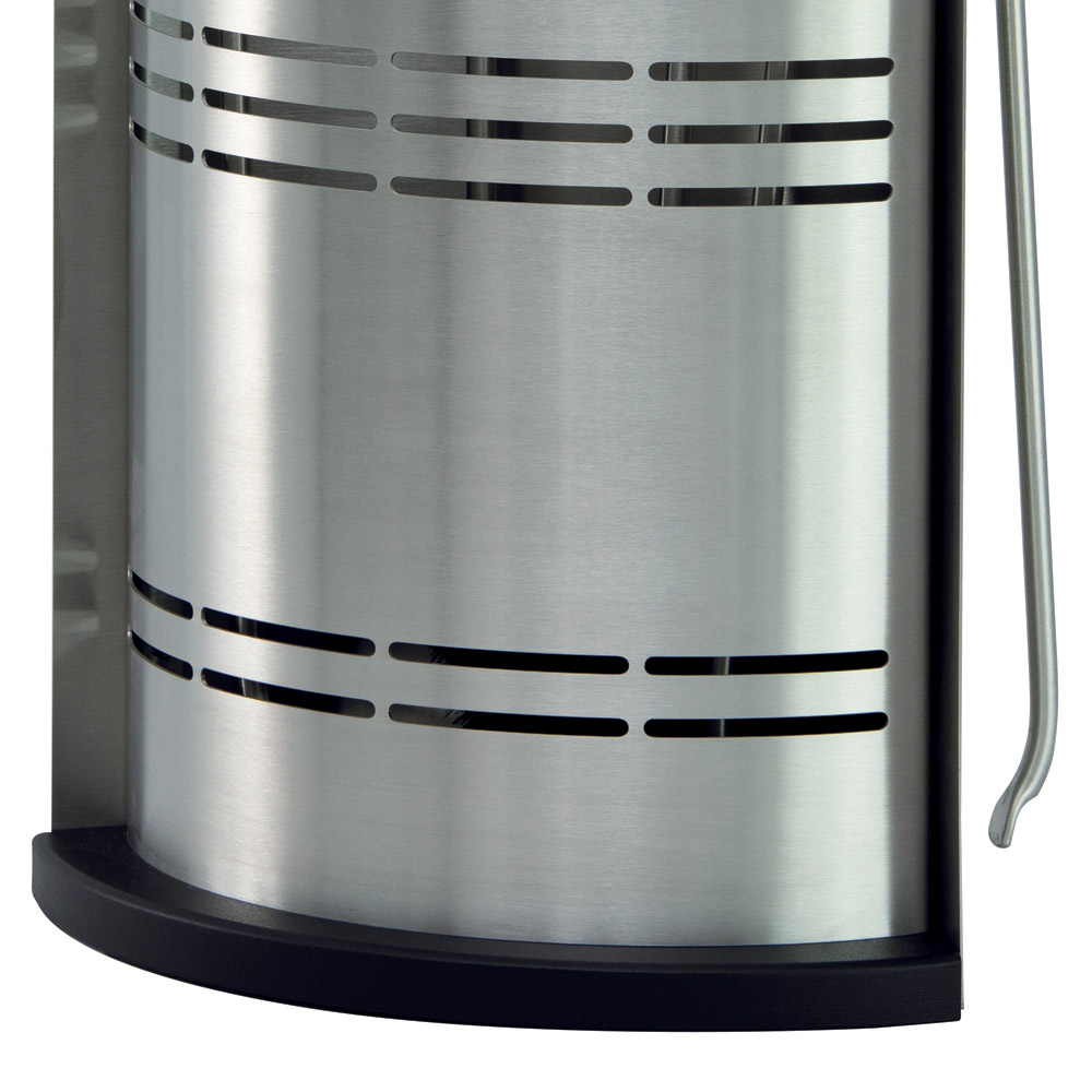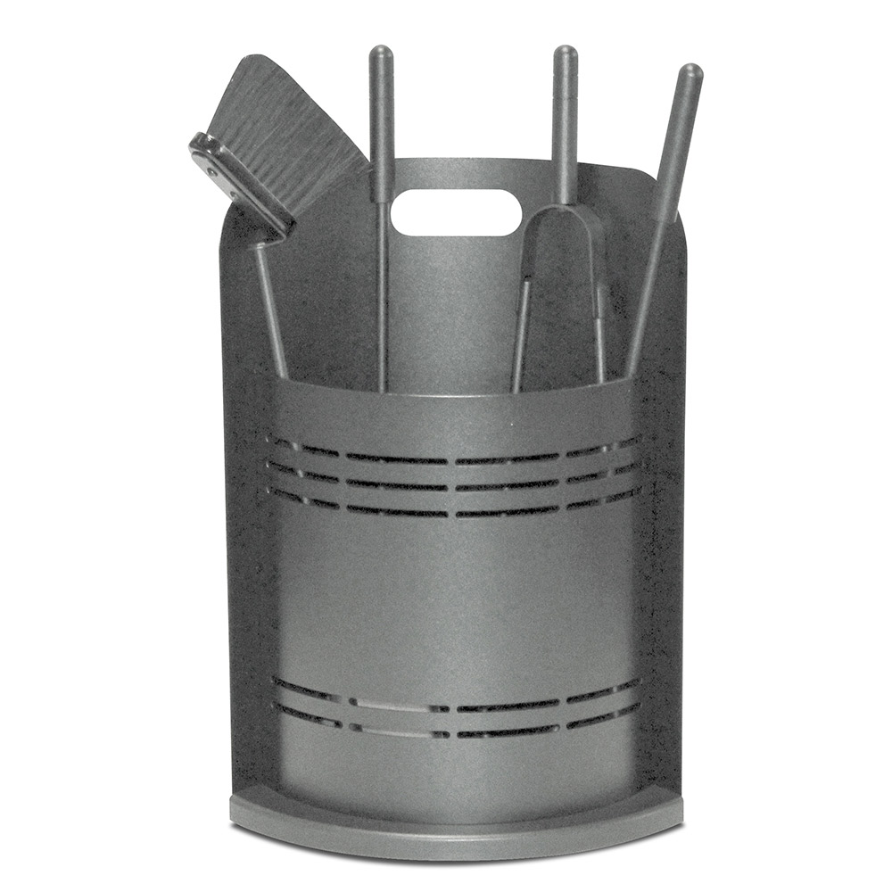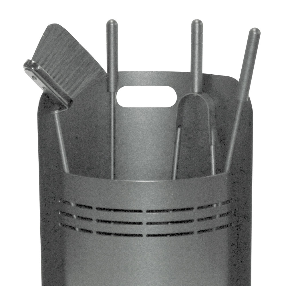 Este porta-ferramentas para lareira é ideal para quem procura um toque de design contemporâneo . A sua forma cilíndrica é elegante e economiza espaço, enquanto as ranhuras horizontais não só criam um detalhe visual atraente, mas também garantem ventilação adequada para o equipamento.