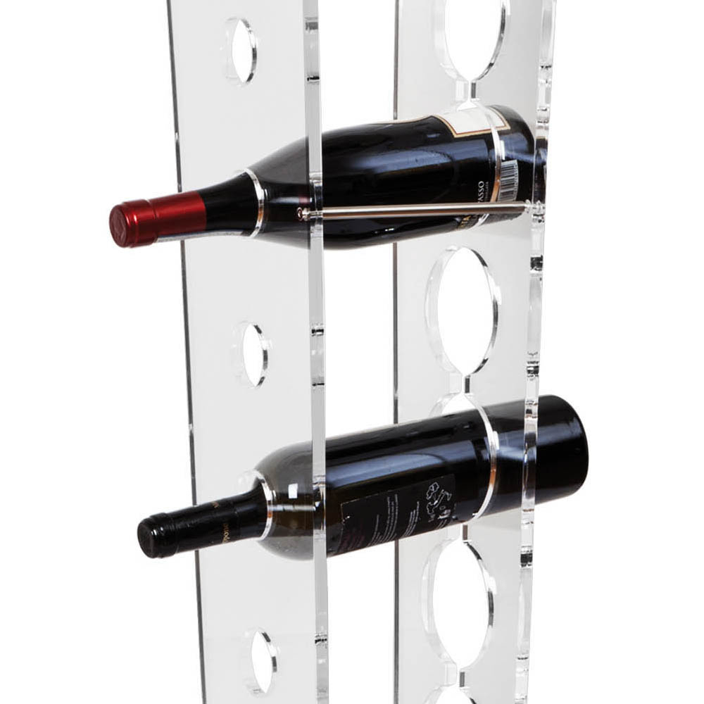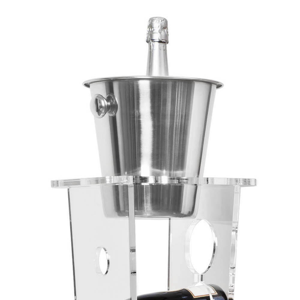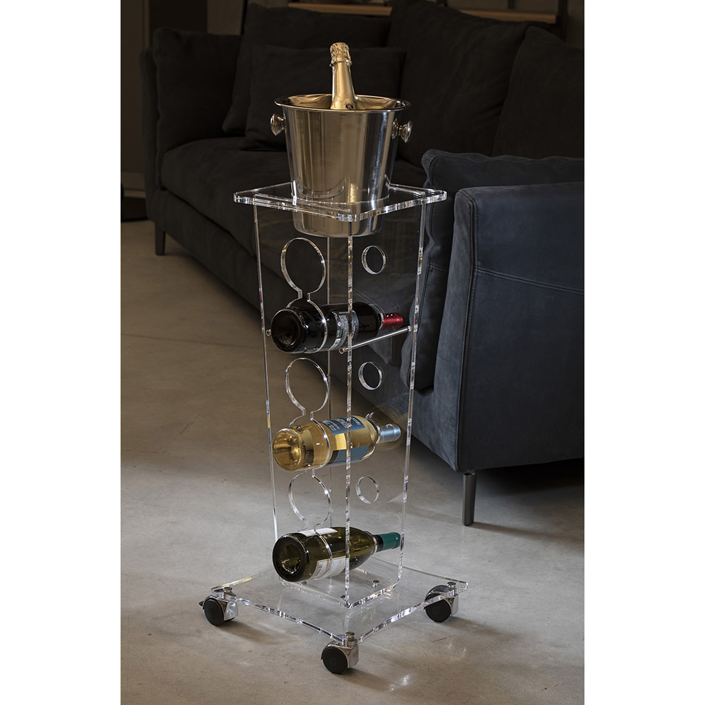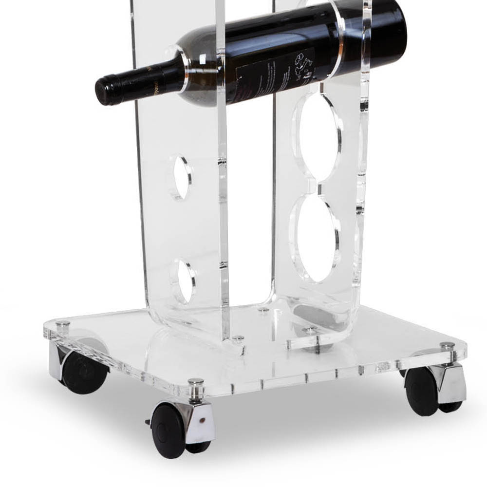 O porta-garrafas de vinho autônomo é caracterizado por um design elegante sobre rodas feito inteiramente de cristal acrílico transparente.