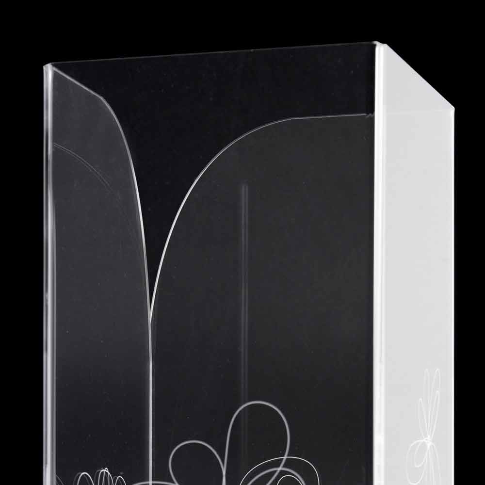 Porta guarda-chuvas em plexiglás transparente que se caracteriza por decorações florais marcadas a laser de estilo estilizado com base em aço inoxidável.