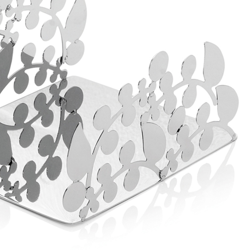 Este porta-guardanapos apresenta um design retangular sofisticado e elegante , inteiramente feito de metal prateado com decorações naturais.