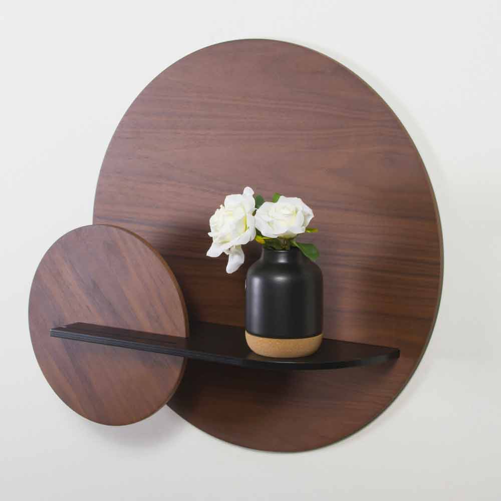 Prateleira de design em painéis redondos modulares em contraplacado de nogueira.