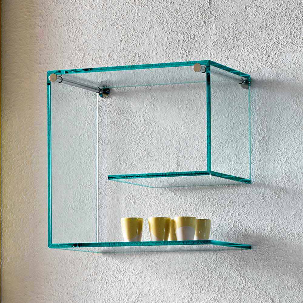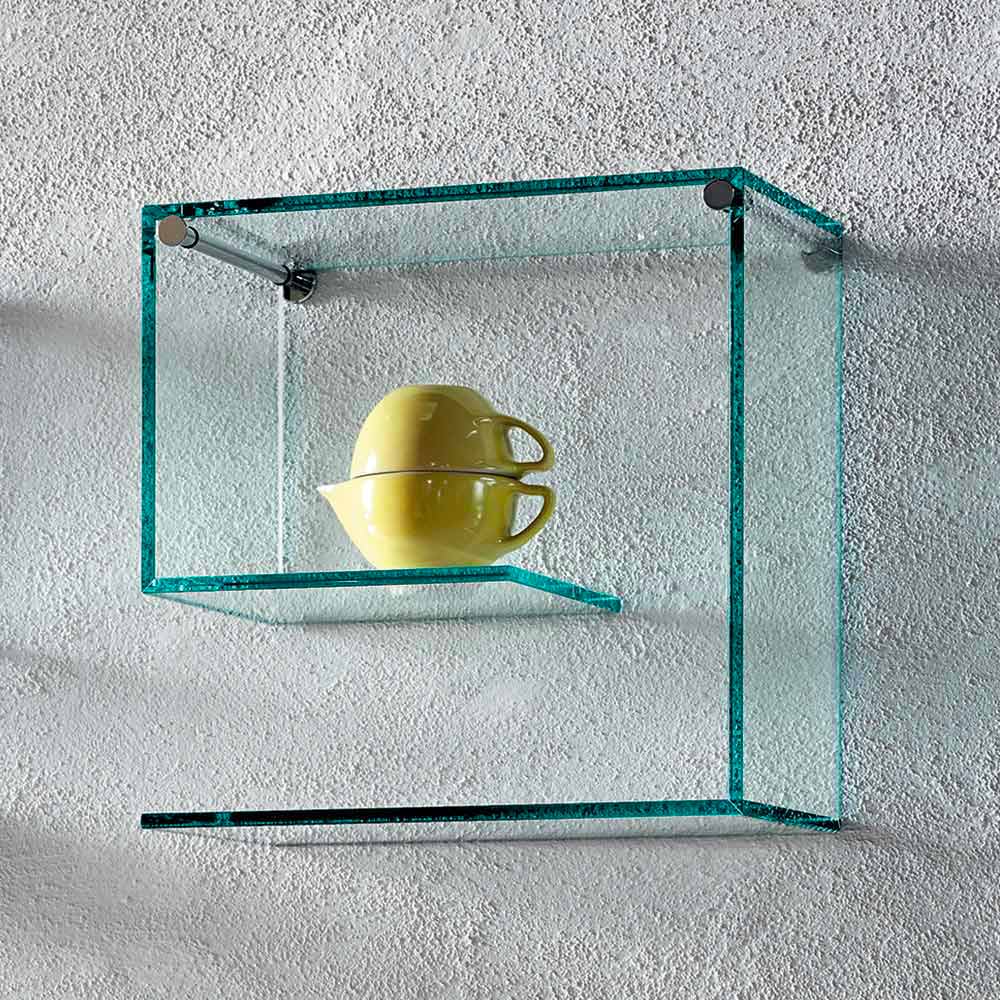 Este par de estantes de parede é caracterizado pelo seu design versátil e geométrico inteiramente feito de vidro float de 10 mm de espessura no acabamento transparente.
