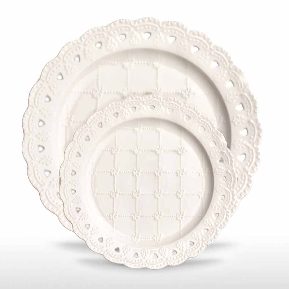 relevos florais e decorações perfuradas à mão que melhoram os pratos, tornando a mesa glamourosa e elegante.