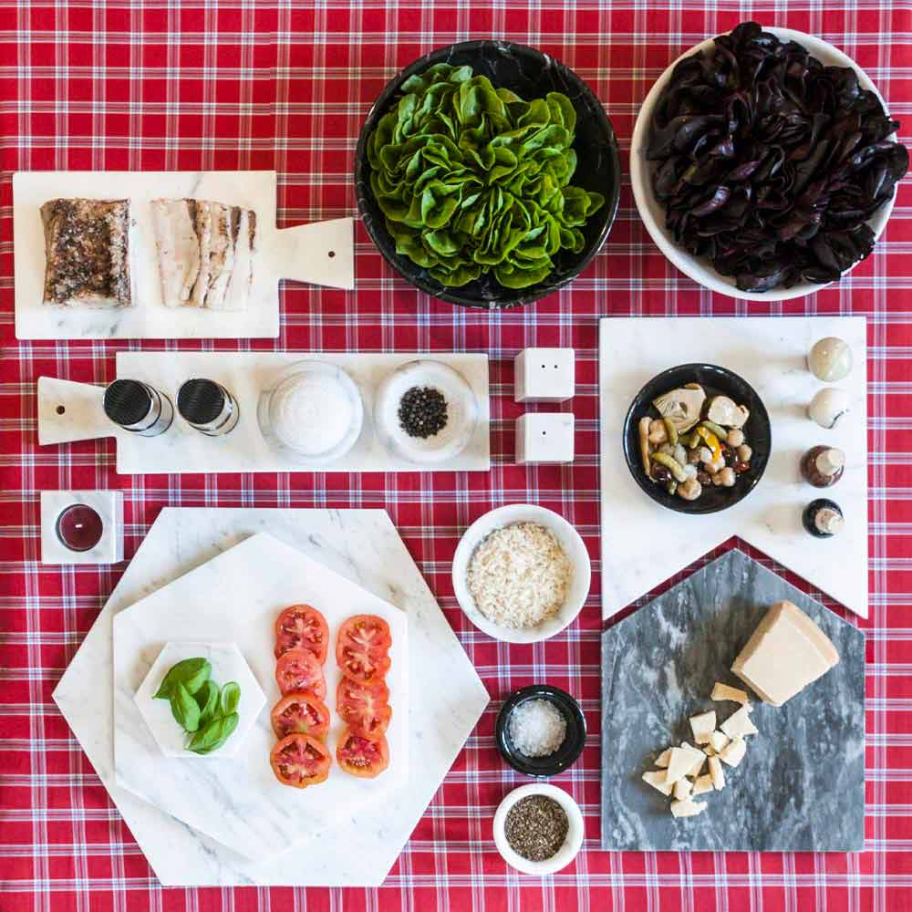 mármore elegante em dois acabamentos que, graças ao seu design inovador, ele também pode ser usado como uma placa de bandeja ou de corte.