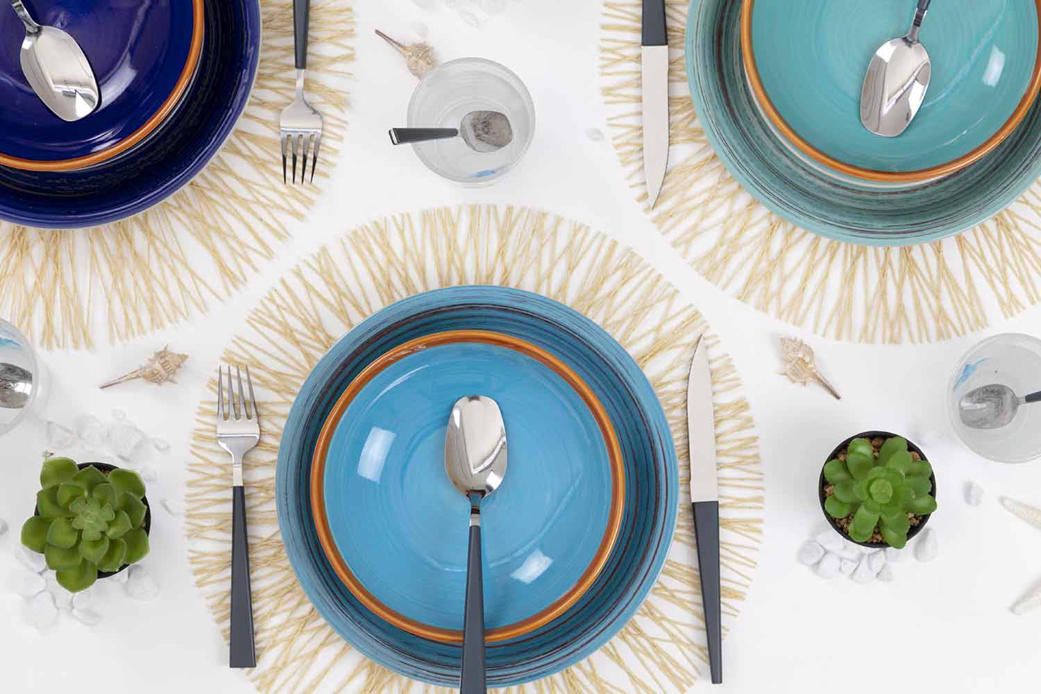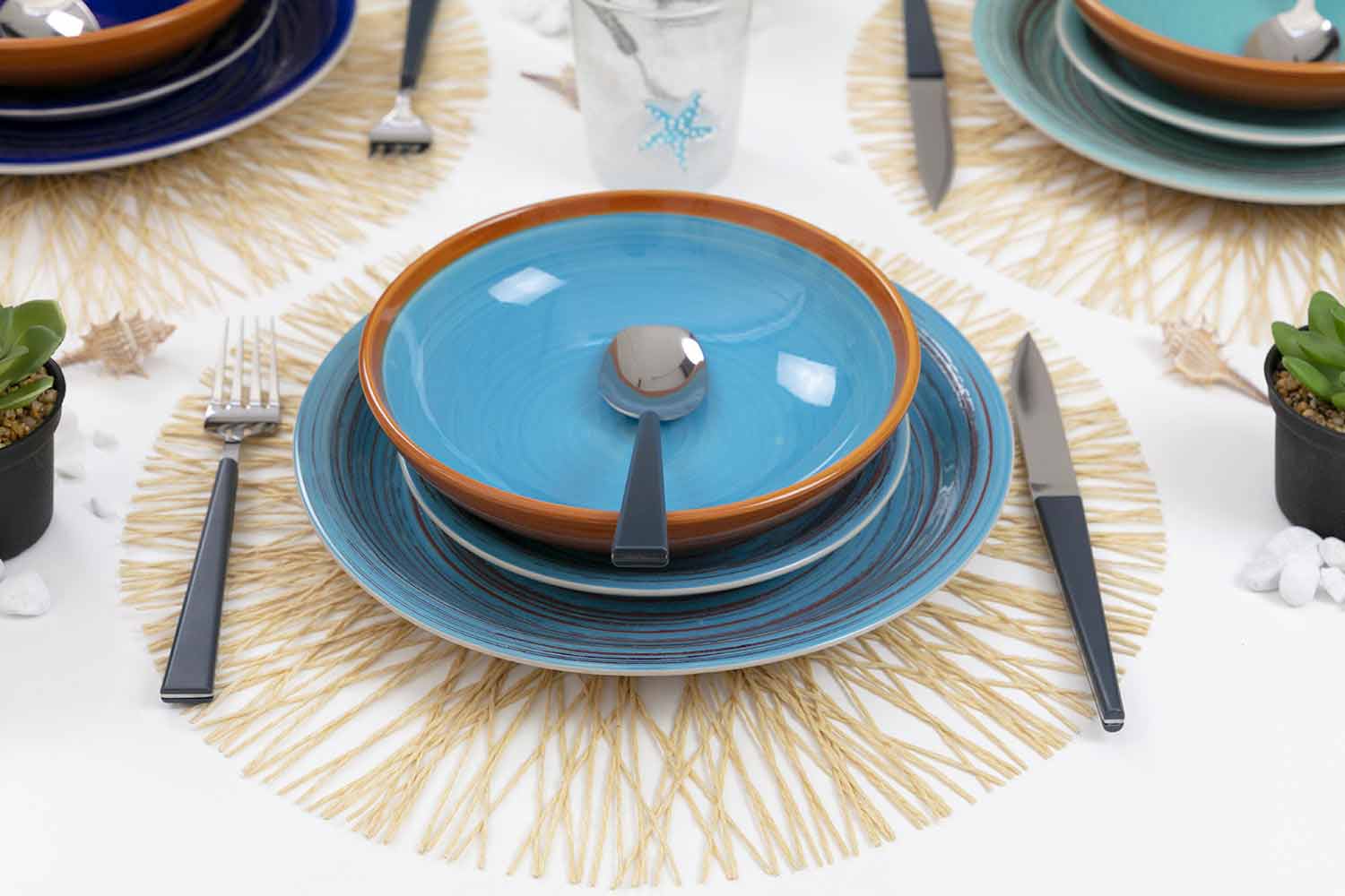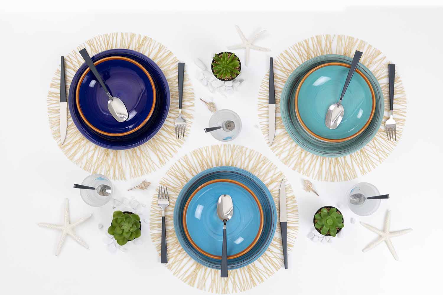 Pratos coloridos e modernos de 18 peças em grés, serviço de mesa completo.