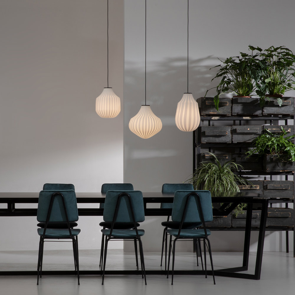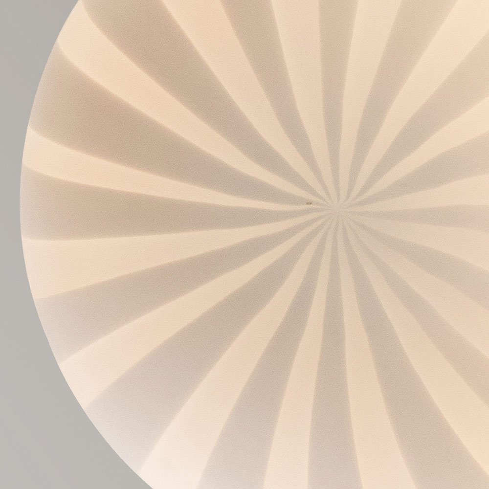 O candeeiro é feito com um difusor de vidro filigranado branco de construção artesanal , material que confere brilho e modernidade à luz, que por ela passa criando ambientes sublimes e envolventes, e uma base de alumínio amovível.