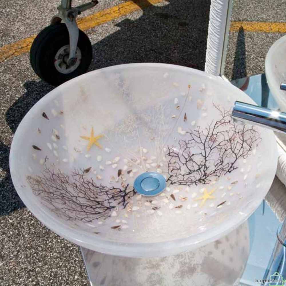 Lavatório em resina de opala transparente com inclusões de corais, conchas e estrelas do mar.