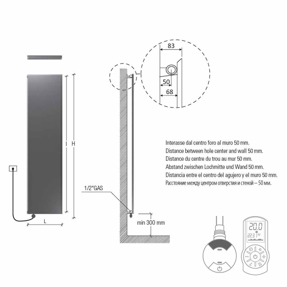 O termostato de 110 mm deve ser adicionado à altura. Caixa termostática branca como padrão para radiadores brancos; cromo para os radiadores coloridos e acabamentos em aço inoxidável. Fonte de alimentação monofásica de 230 volts.
