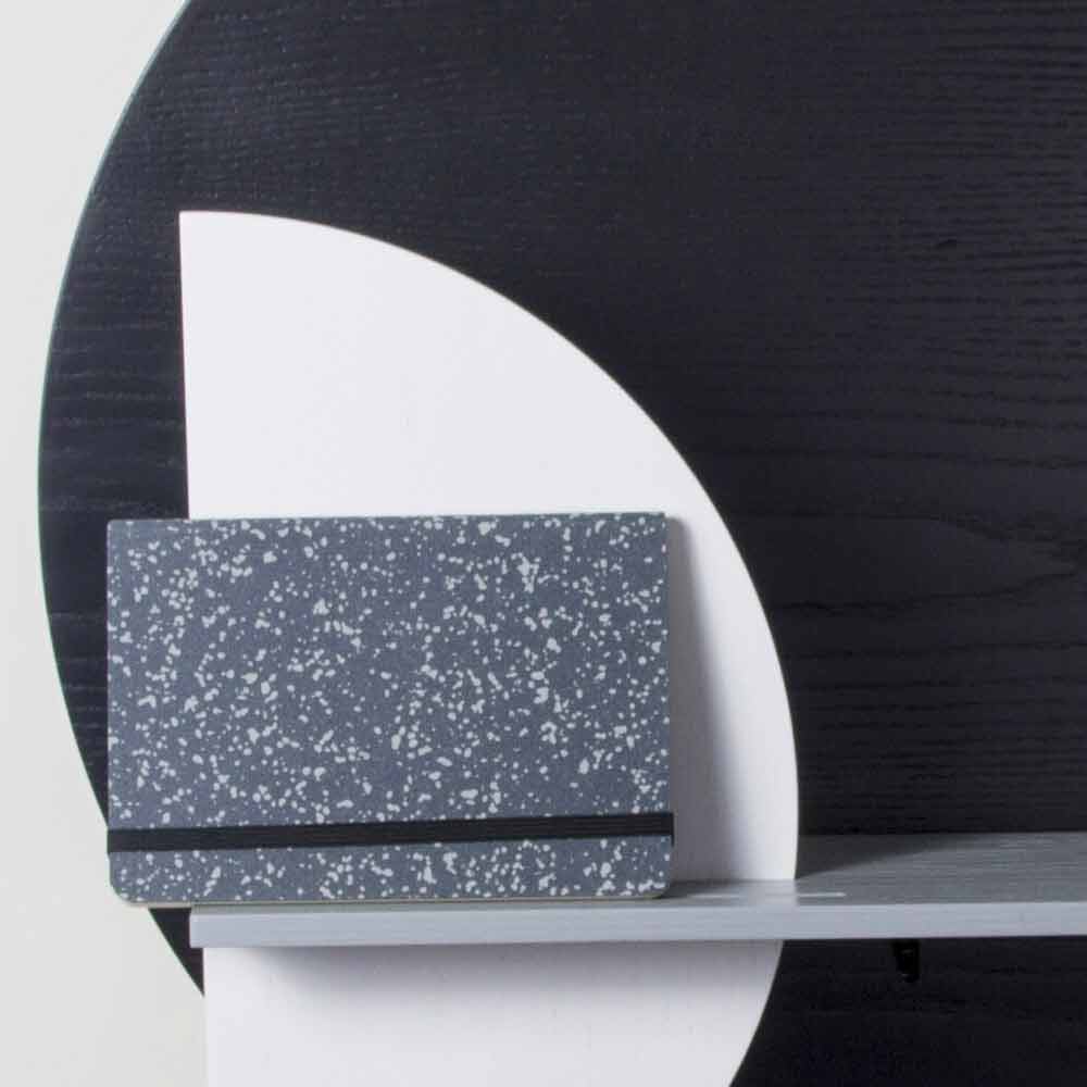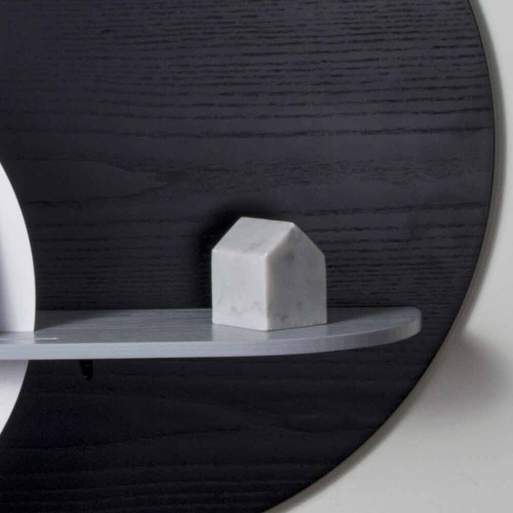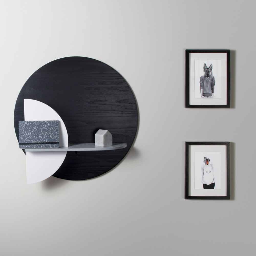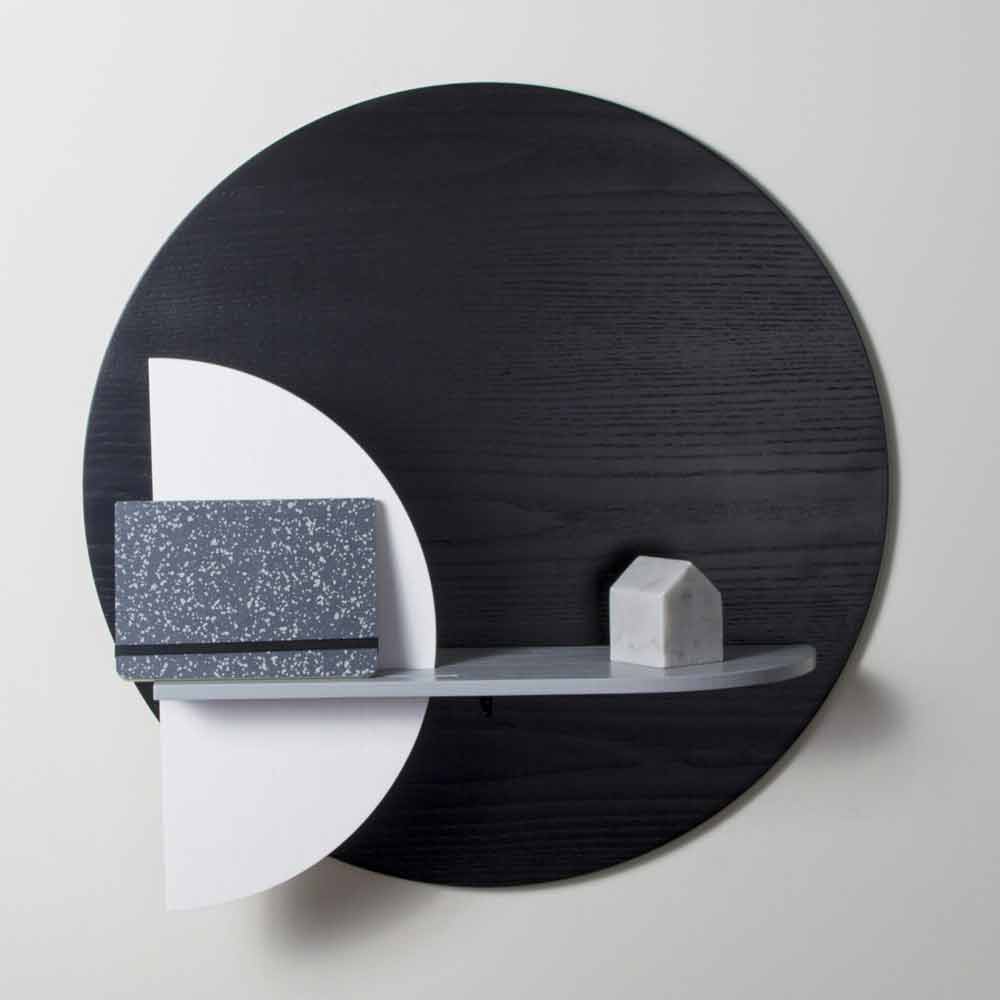 A sua estrutura é composta por 3 painéis de diferentes formas em contraplacado de freixo manchado a branco, preto e cinzento, um dos quais montado na parede que representa a real superfície de suporte e dois painéis verticais que lhe dão movimento e harmonia. A particularidade desta prateleira é a possibilidade de personalizar o produto combinando os 2 painéis verticais que permitem escolher entre 8 configurações diferentes de acordo com gostos e necessidades.