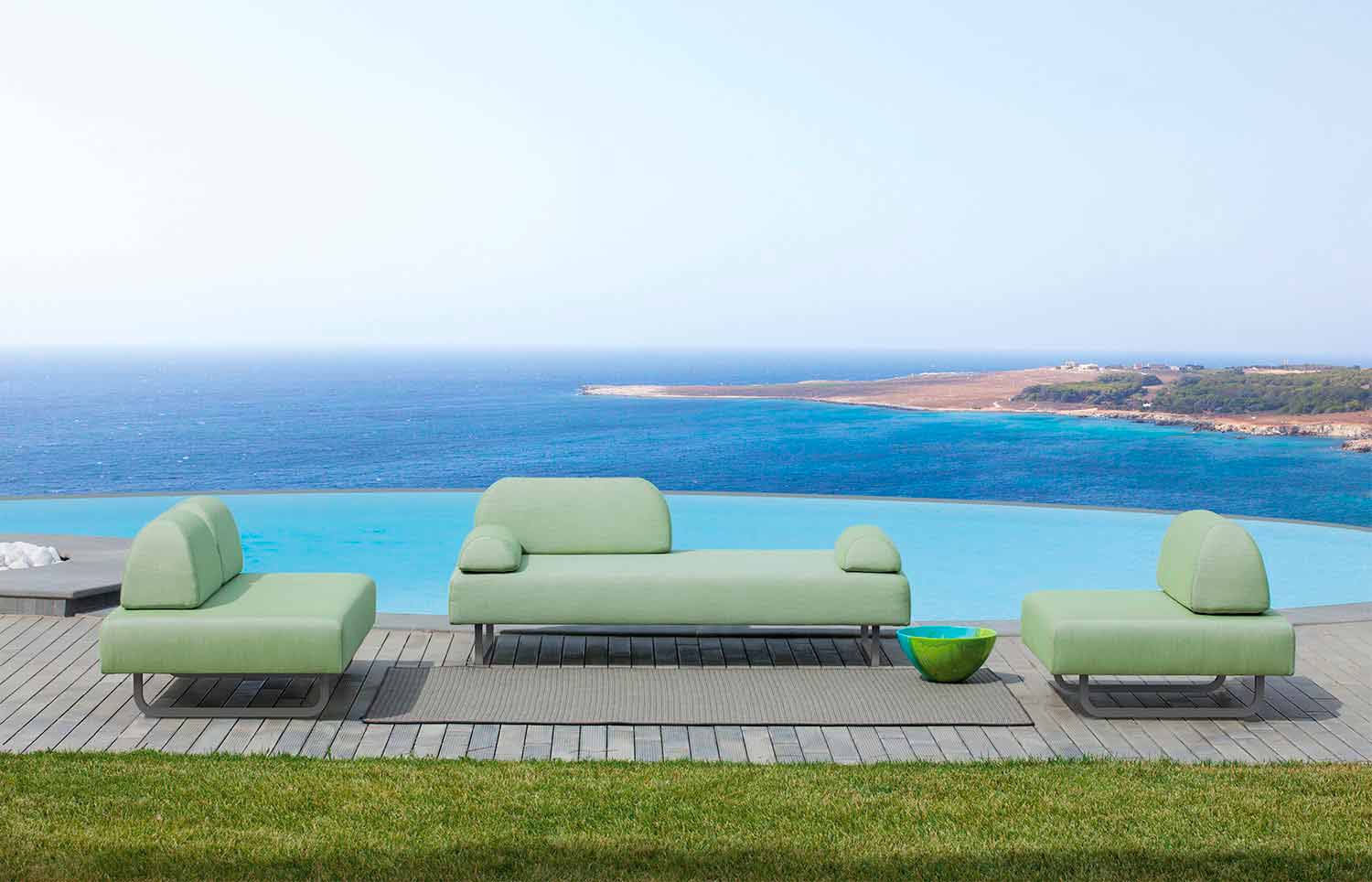 Pufe quadrado 90x90 cm para design externo em ferro galvanizado com revestimento em pó e tecido acrílico 100% tingido. Fabricado na Itália.
