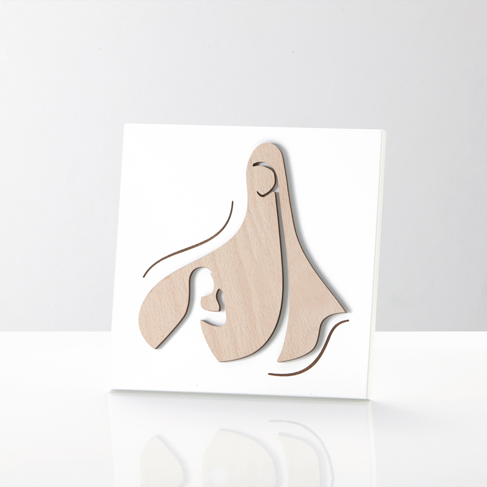 Quadro sacro representando a aparição de Nossa Senhora em madeira natural e gravado a laser. Painel de madeira lacado branco com pé de apoio e furo para pendurar na parede.