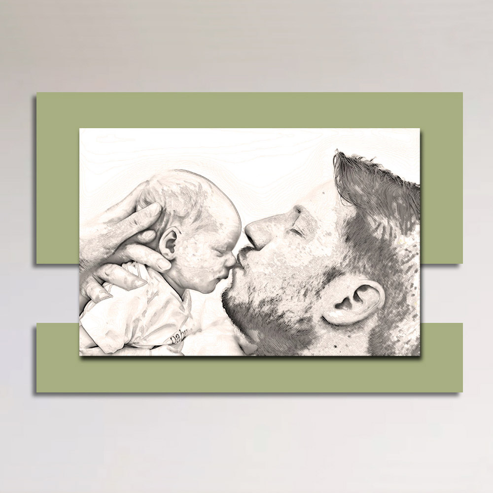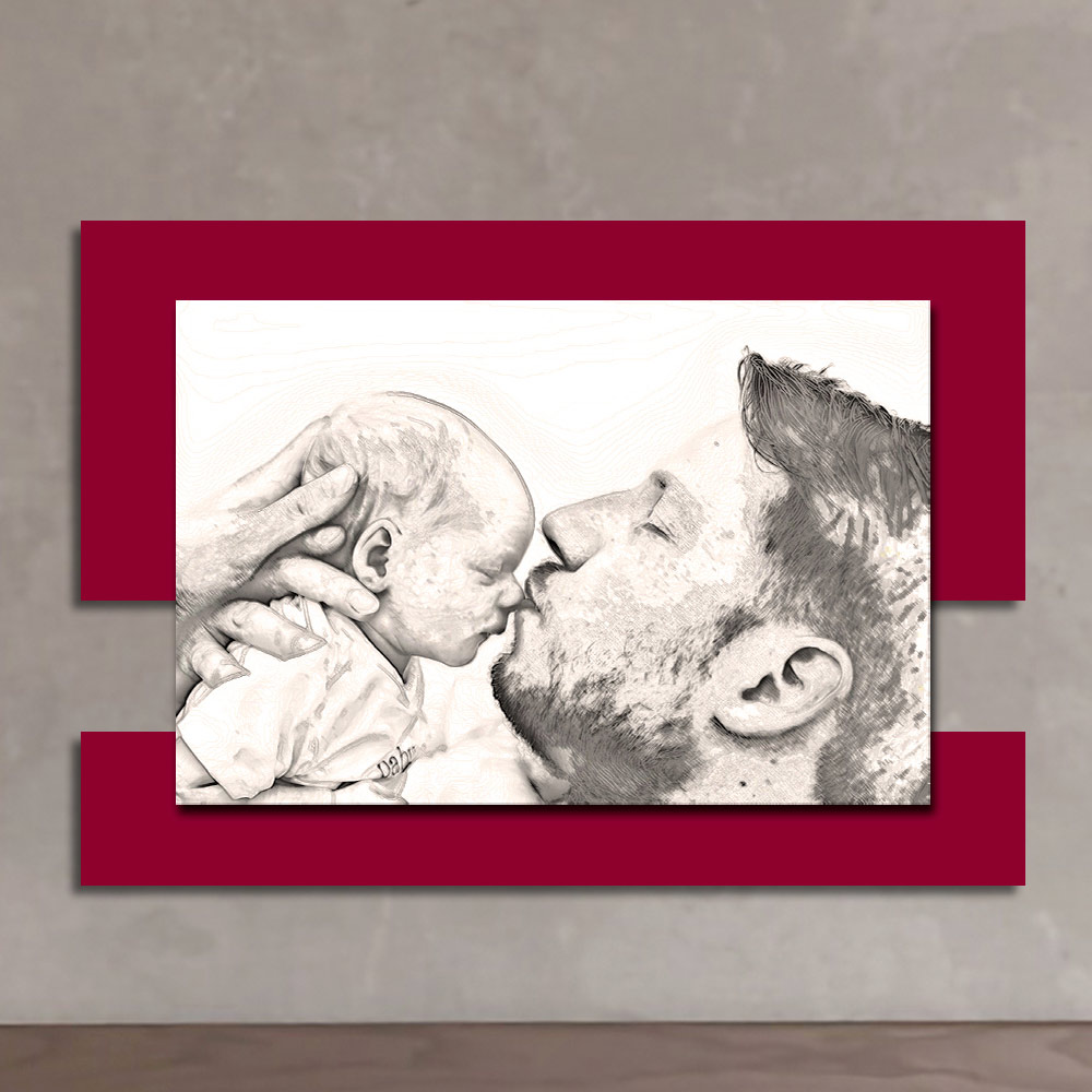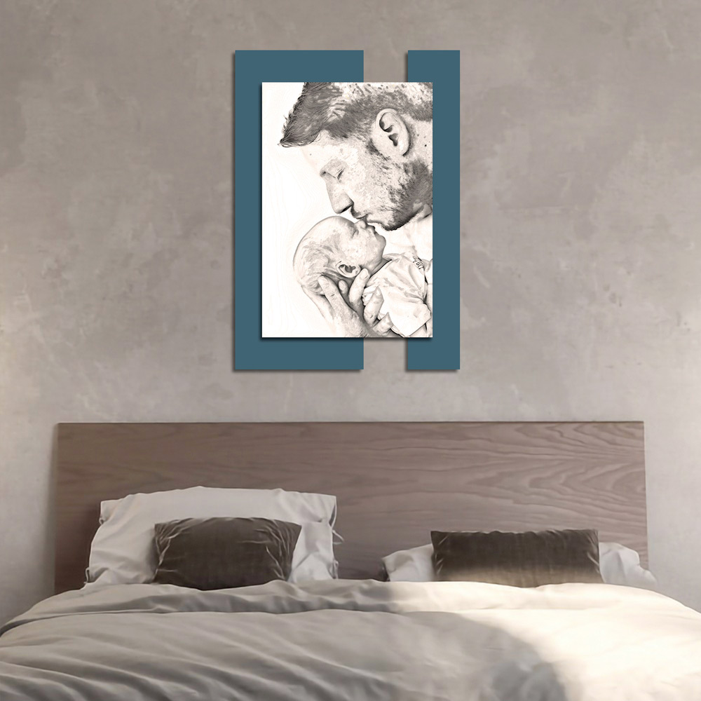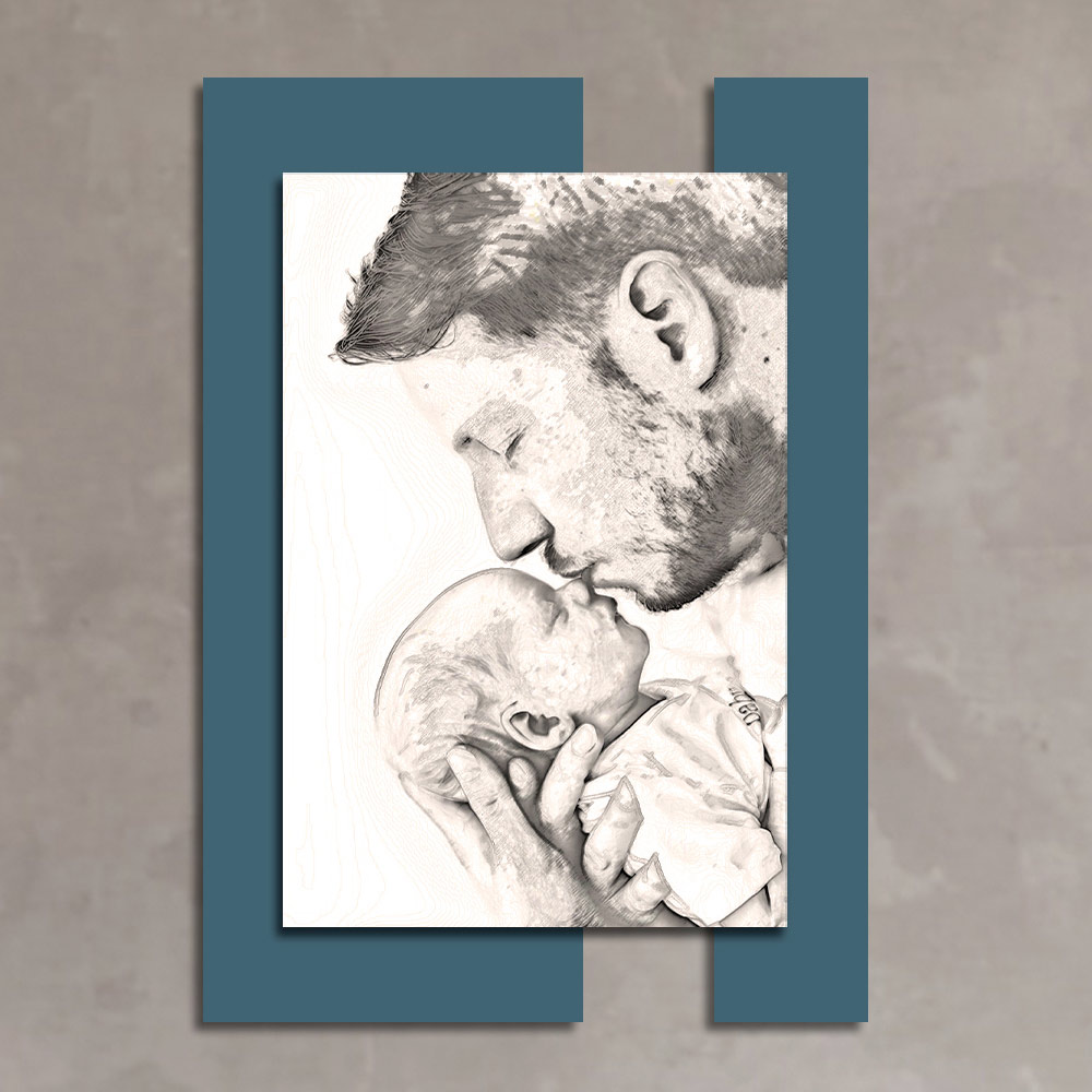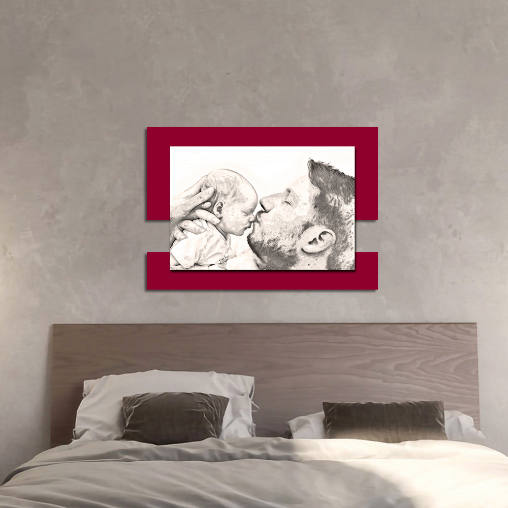 madeira com estampa de um homem beijando uma criança. Buchas para pendurar