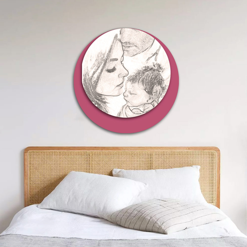 Amor, carinho, proteção são as emoções que surgem ao olhar para esse quadro em que a família está unida e tem um jogo de olhares em que ele olha para ela, ela olha para o filho que está de frente para ela. Os acabamentos, a madeira escolhida para a produção e a técnica de impressão realçam toda a