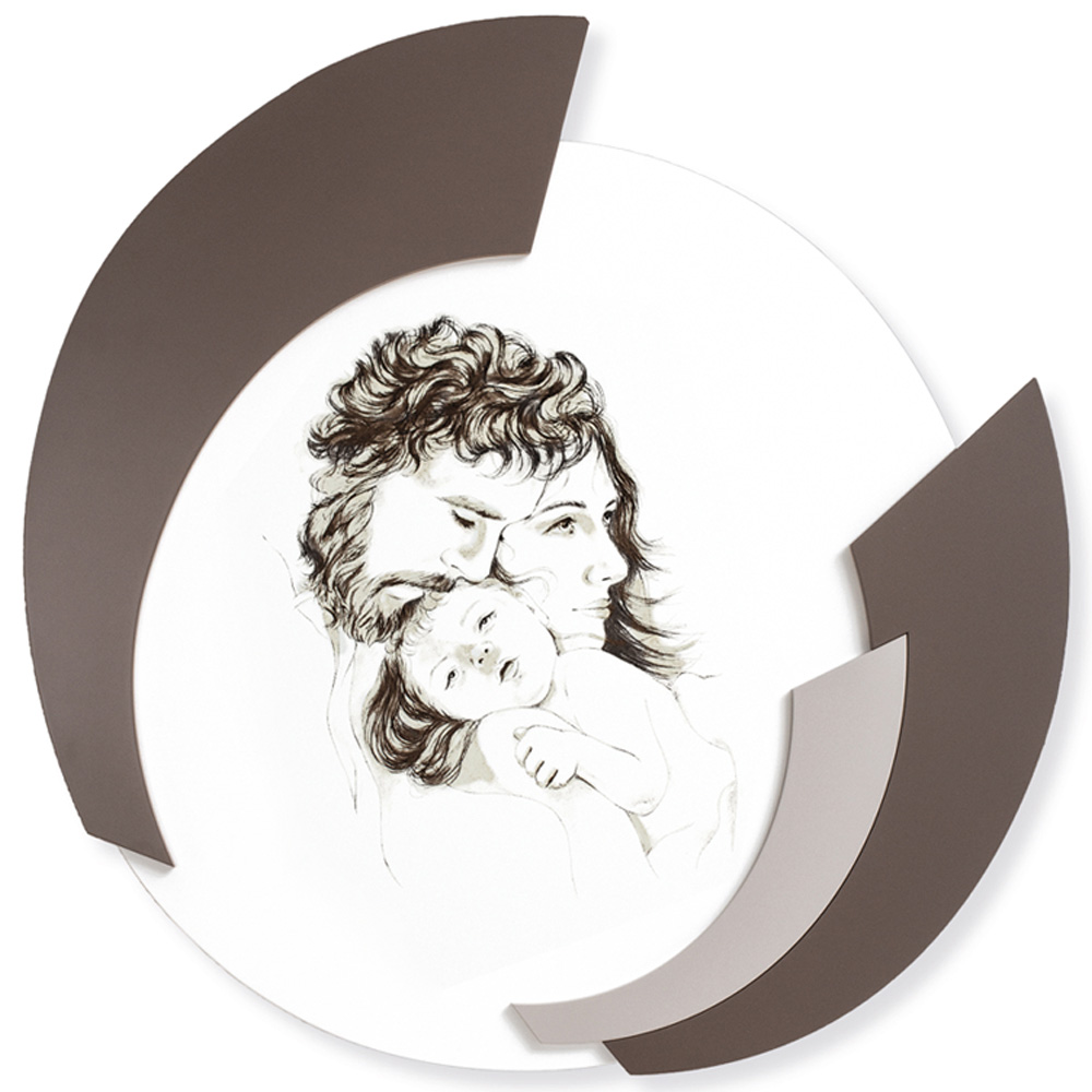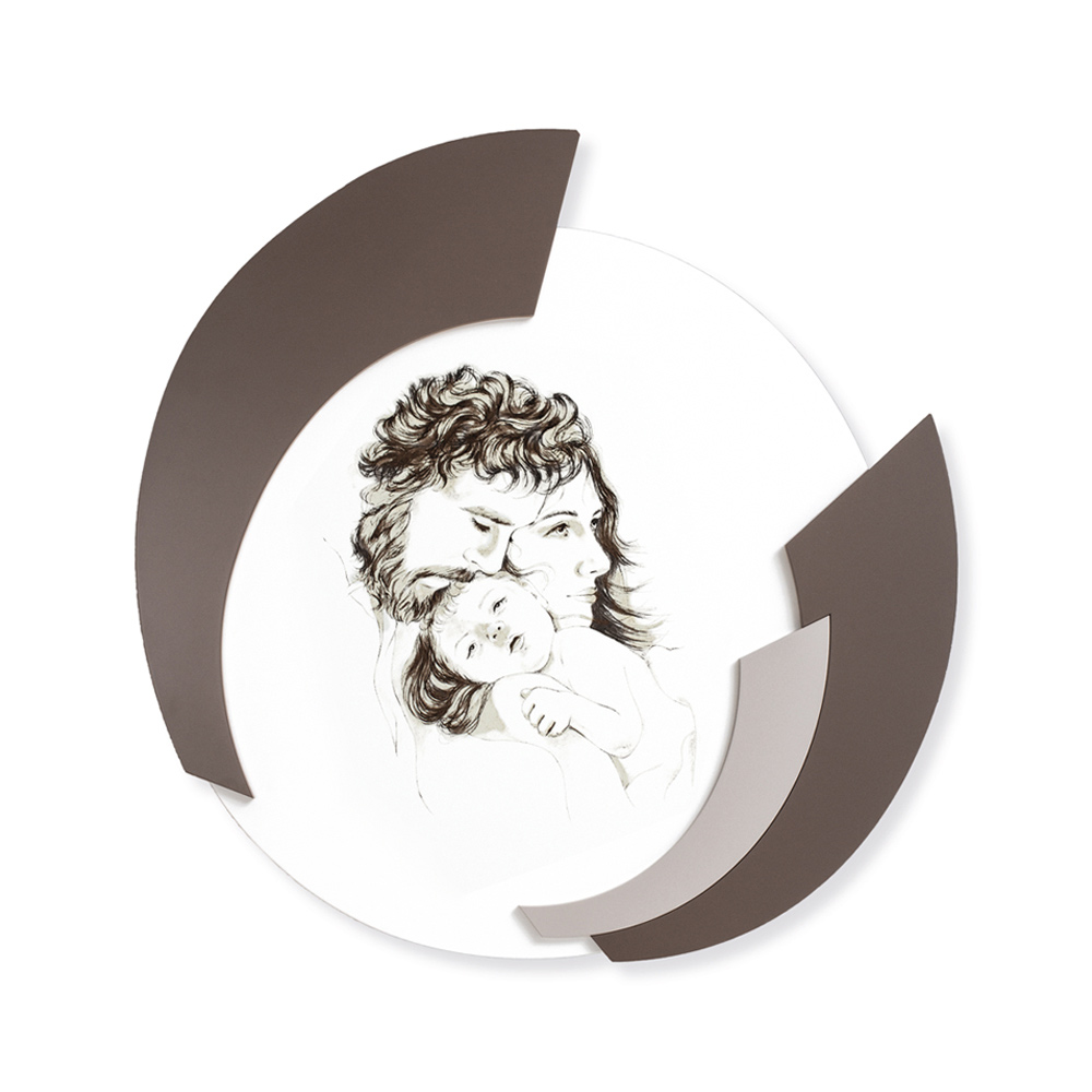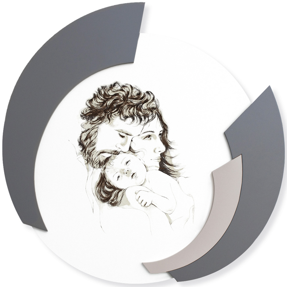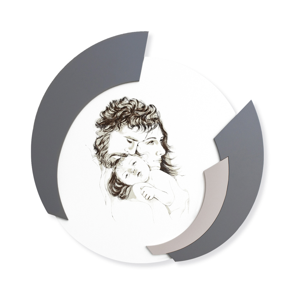 Cabeceira redonda que encerra a imagem da Sagrada Família rodeada por decorações em madeira lacada às cores à sua escolha . Painel de madeira lacado a branco mate com marcação a laser, técnica especial que cria um baixo-relevo nos materiais. O desenho original feito à mão aliado à tecnologia laser dá vida a esta obra gravada em vários níveis.