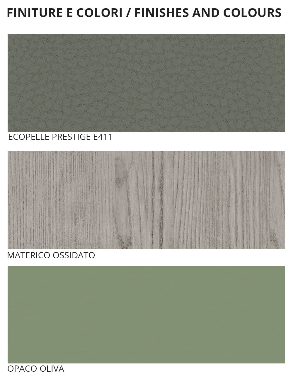 cabeceira revestida em couro ecológico , mesa de cabeceira com uma gaveta e cômoda com 4 gavetas (composta por 4 elementos modulares) em madeira lacada oxidada e mate com acabamento oliva ,