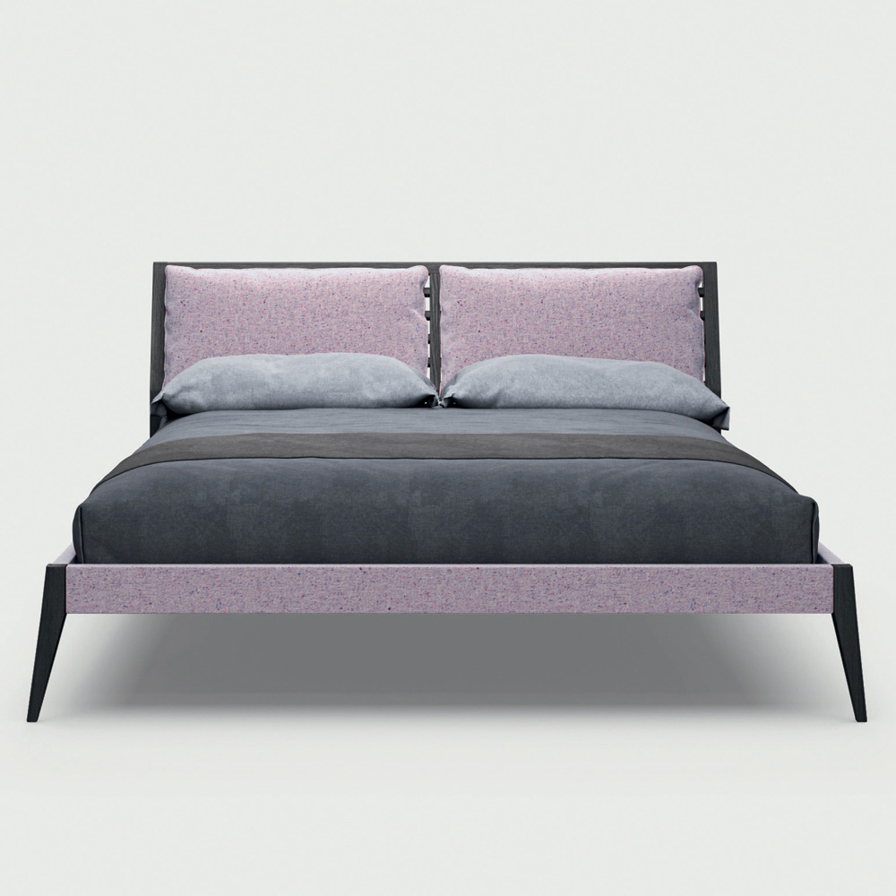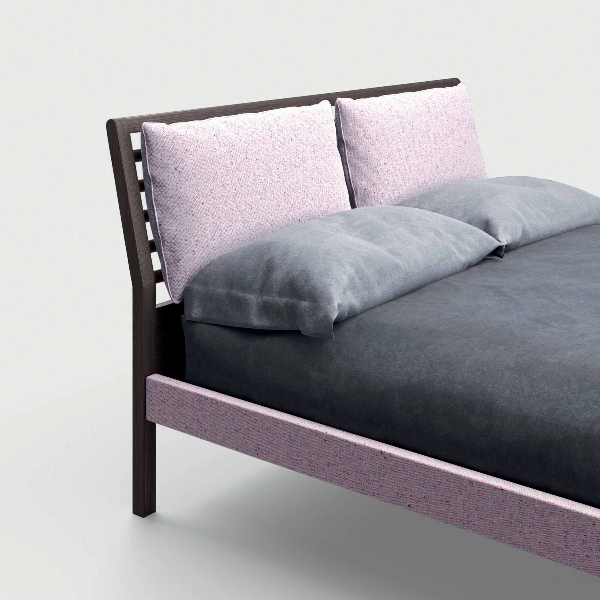 estrutura de cama estofada em tecido combinando com as duas almofadas que cobrem a cabeceira,