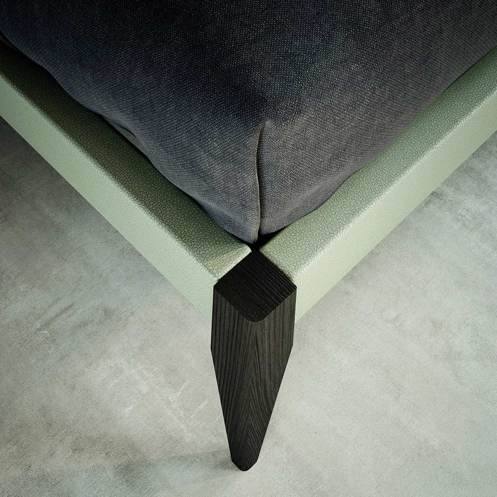 equilíbrio visual perfeito entre os abundantes volumes da cabeceira, enriquecidos pela particular costura central, e as linhas sóbrias e essenciais da estrutura da cama. Os elementos que o envolvem combinam-se com ele, criando uma
