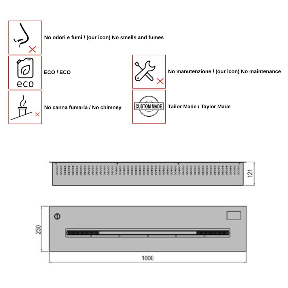 Queimadores encastrados electrónicos com controlo remoto, fabricados em aço inoxidável escovado e adequados para serem incorporados em superfícies planas ou em lareiras à medida. Para lareiras maiores, é possível combinar vários queimadores em linha. A ativação e desativação do fogo é obtida pela operação de um controle remoto, que regula os três poderes da chama.