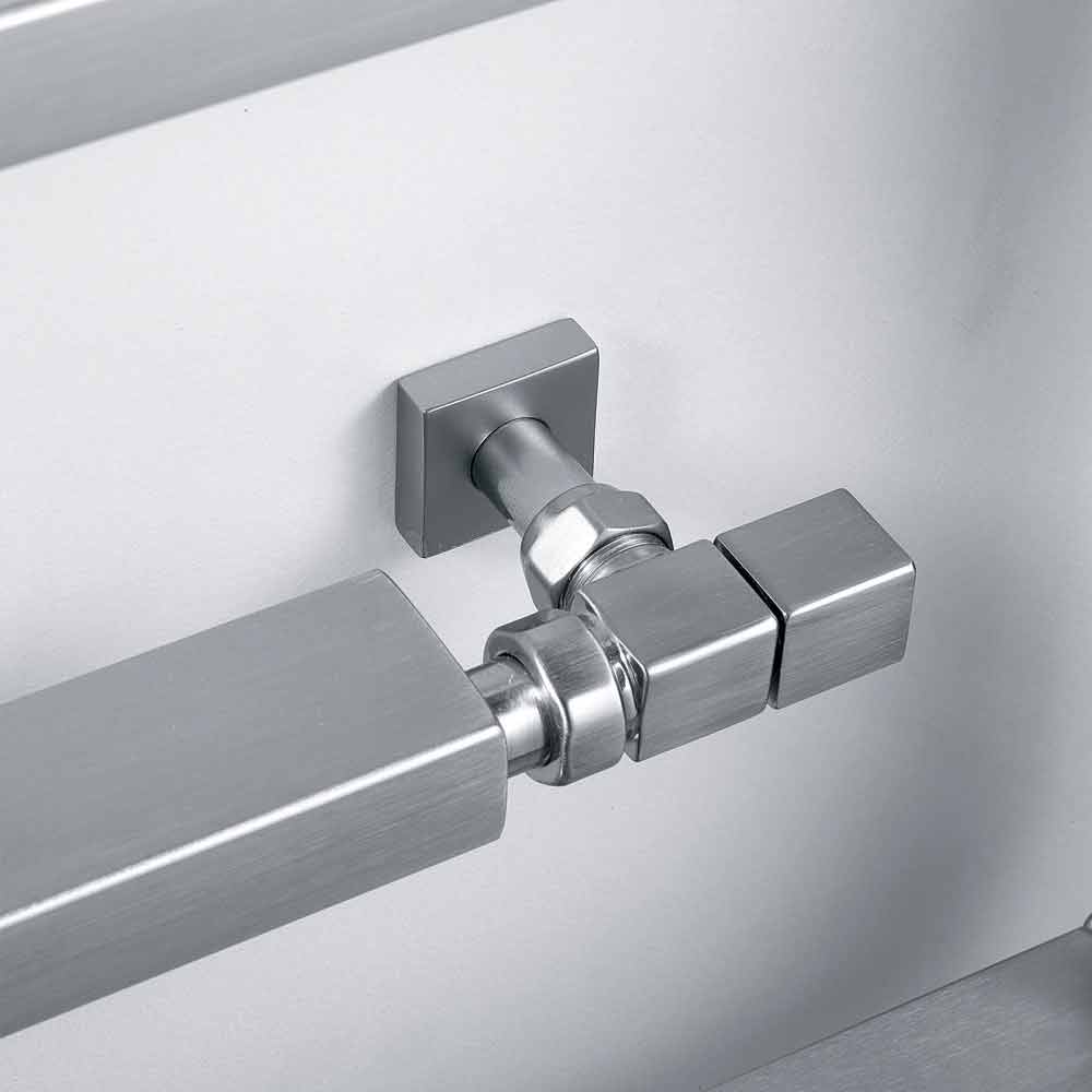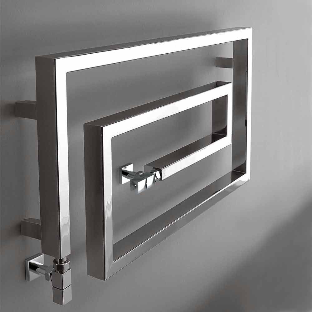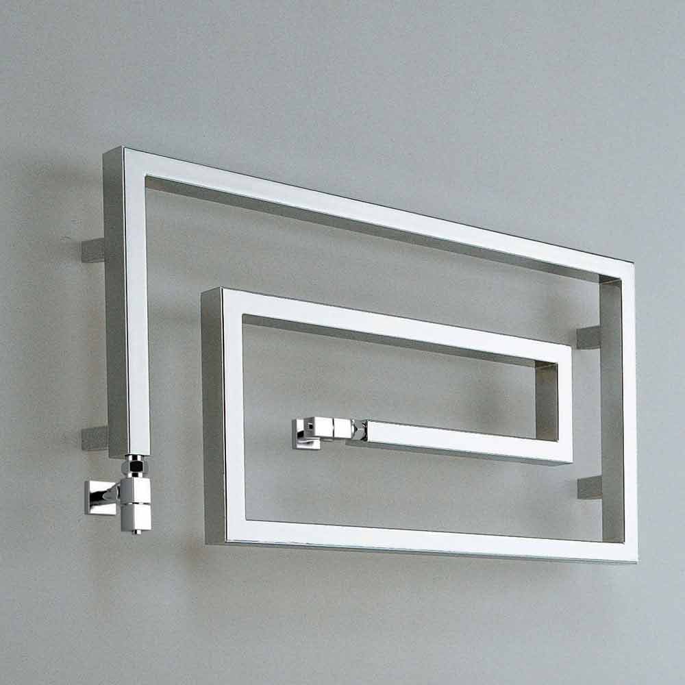 Radiador em aço cromado, na versão hidráulica. Uma coleção com um forte sinal gráfico. Forma, material, função e tecnologia criam não mais simples aquecedores de toalhas, mas verdadeiros elementos de decoração.