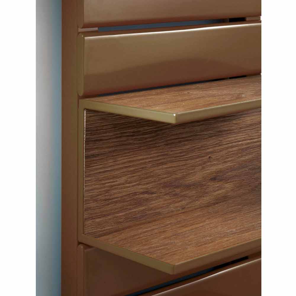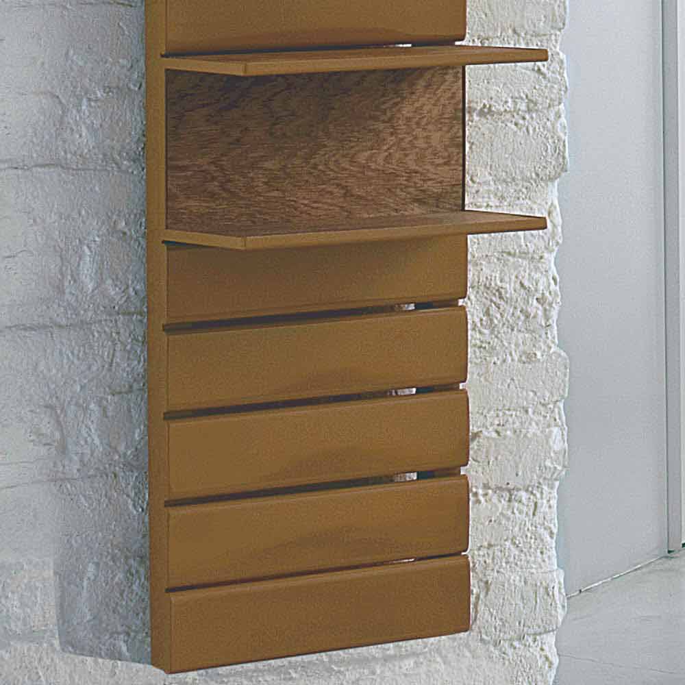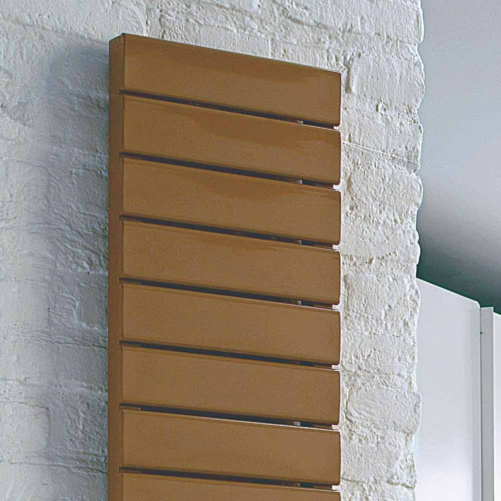 Radiador hidráulico, prático e funcional com design linear, aquece e organiza todos os ambientes em que está inserido. Radiador vertical em aço colorido, completo com prateleiras (conforme foto) com encosto-prateleiras e tampo em carvalho natural.