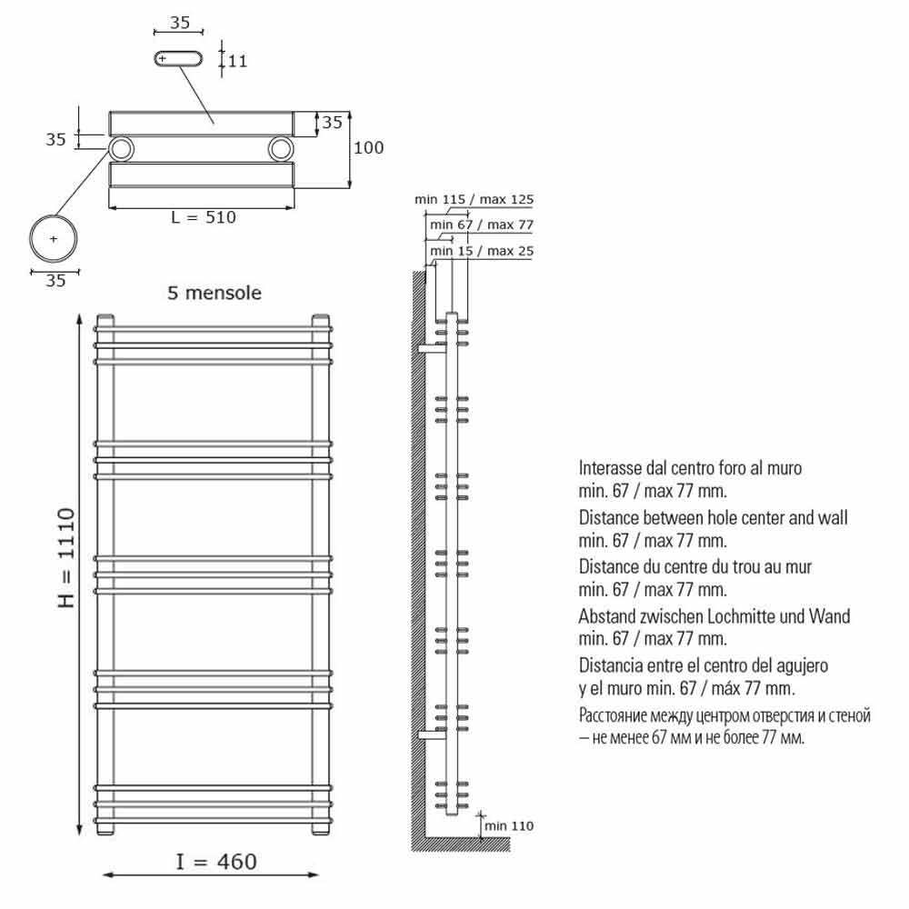 Dimensões *:- H 1110 x C 510 x P 35 x Inter. 460 mm x Saída w (Δt50 *) 530; Rendimento w (Δt30 *) 290; Rendimento w (Δt26 *) 240.