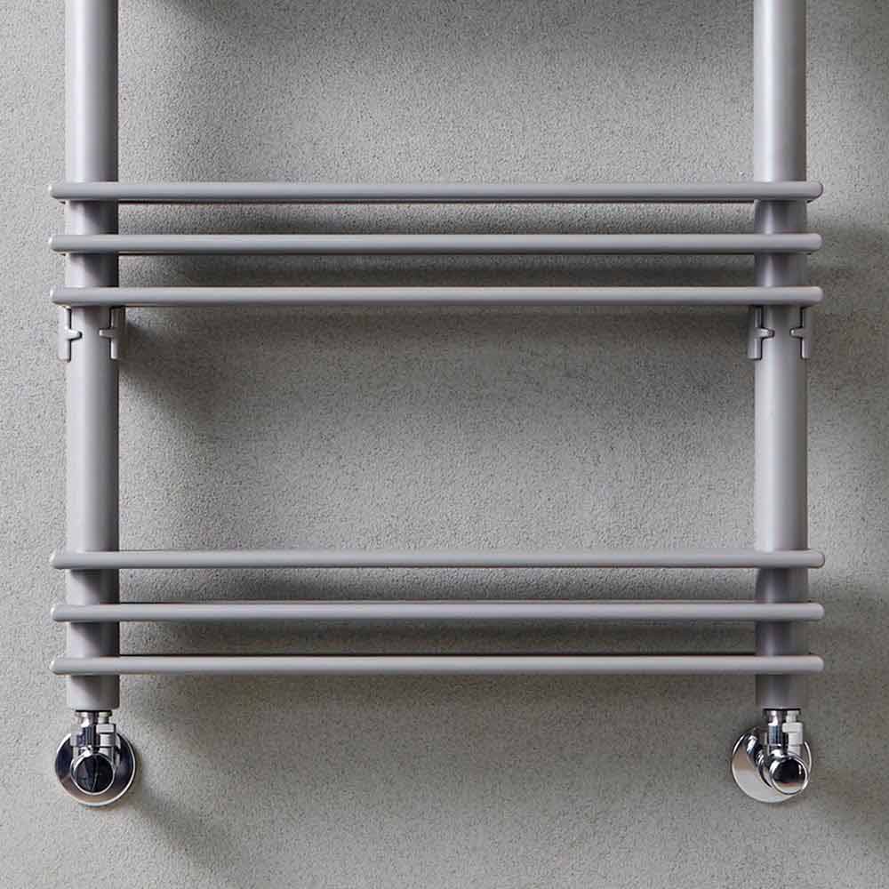 radiador hidráulico tem um design multifuncional constituído por tubos verticais e placas horizontais que podem desempenhar a função de prateleiras reais.
