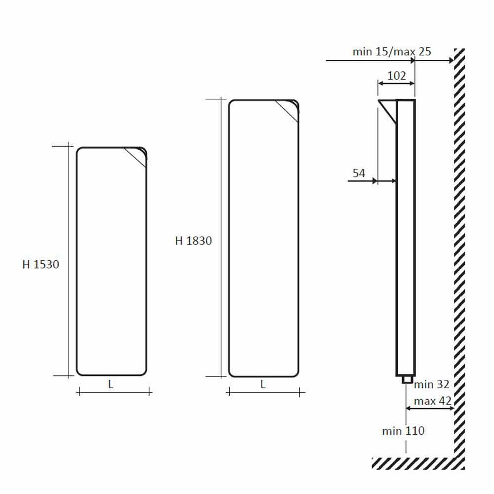 - H 1530 x C 375 x Inter. 50 x P 48 mm x Saída w (Δt50 °) 385; Rendimento w (Δt30 °) 197; Rendimento w (Δt26 °) 166