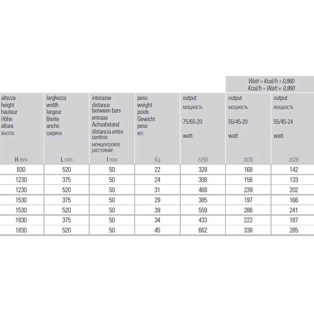- H 1830 x C 520 x Inter. 50 x P 48 mm x Saída w (Δt50 °) 662; Rendimento w (Δt30 °) 338; Rendimento w (Δt26 °) 285