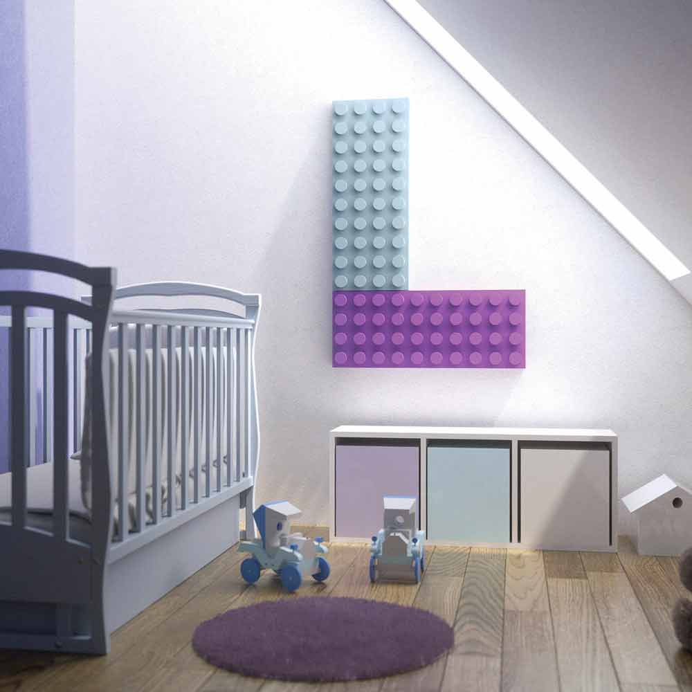 Radiador colorido de estilo moderno e divertido, na versão hidráulica. Um projeto inspirado em um ícone afetivo compartilhado por todos. Múltiplas combinações de cores para elementos modulares horizontais e verticais. Tal como num jogo de construção, os elementos combinam-se, colocando-se lado a lado em função do espaço disponível e do rendimento térmico necessário.