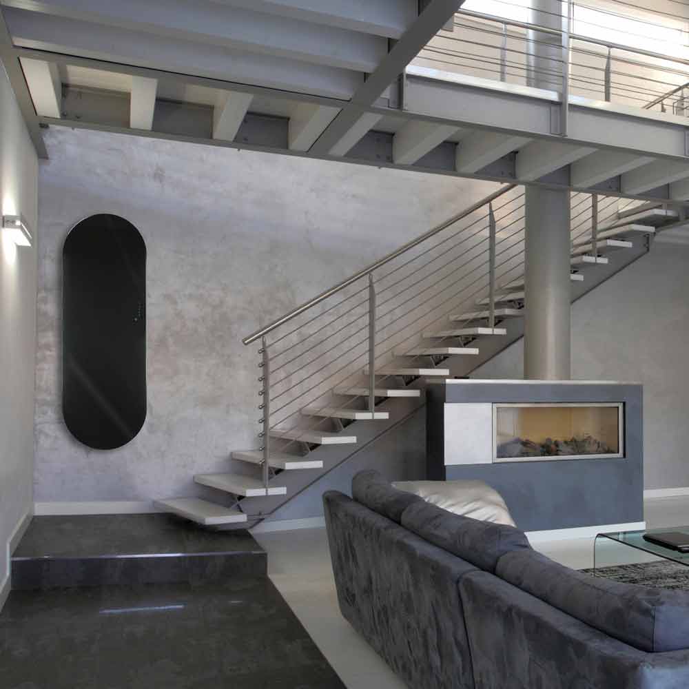 4- Segurança : Construído em vidro temperado, possui a mais alta certificação para vidro de segurança. A construção insere uma película plástica adesiva que permite ao vidro obter a certificação europeia B1 com desempenhos iguais aos de um vidro laminado inquebrável. Os suportes especialmente concebidos evitam, uma vez instalado o produto, a libertação inadvertida, de acordo com as normas de segurança alemãs para radiadores. Este radiador elétrico também permite selecionar uma temperatura de superfície baixa (50 ° C) para evitar o contato com superfícies excessivamente altas para crianças ou idosos que possam tocá-las ou encostar-se inadvertidamente nelas.