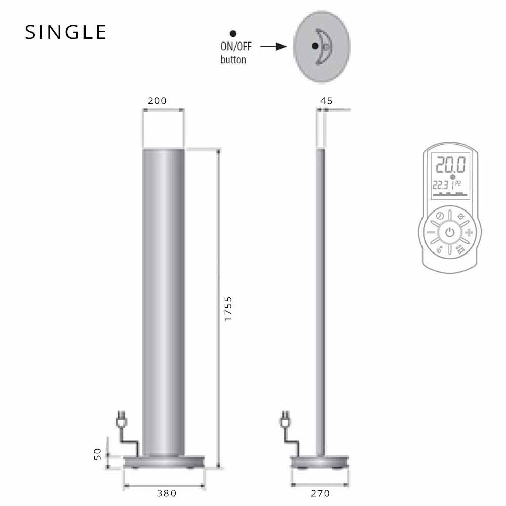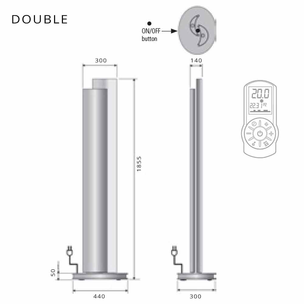 Este aquecedor tem 250 watts de potência para a versão simples e 500 watts para a versão dupla, fornecido com controle remoto padrão para ajuste das luzes de LED e termostato com programação diária / semanal. Cabo de 1,5 metros com plugue schuko. Fonte de alimentação monofásica de 230 volts.