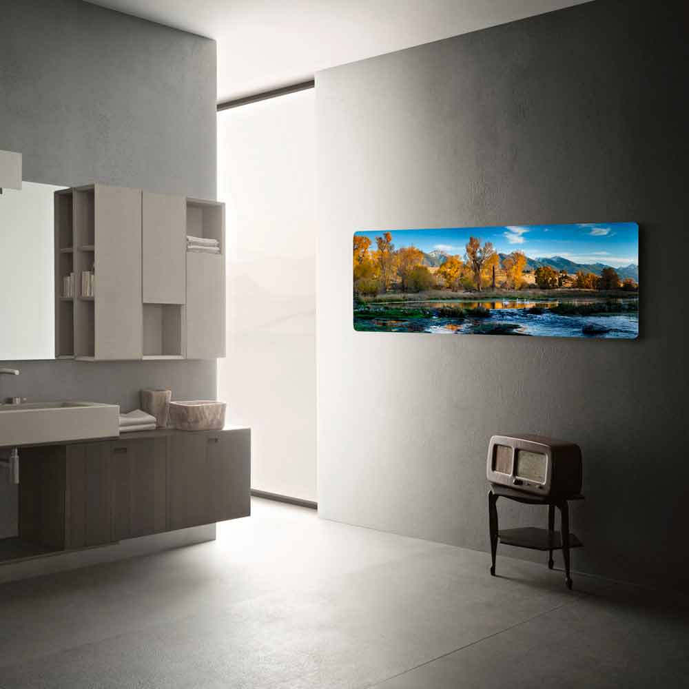 5- Desenho : Comparado com os elementos de aquecimento tradicionais, este radiador apresenta dimensões globais limitadas, pois reduz ao mínimo a espessura da placa, atingindo um estorvo máximo de 6 cm da parede.
