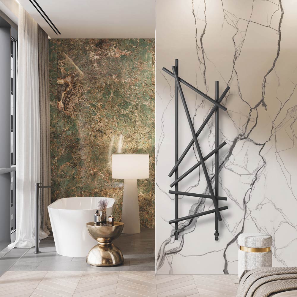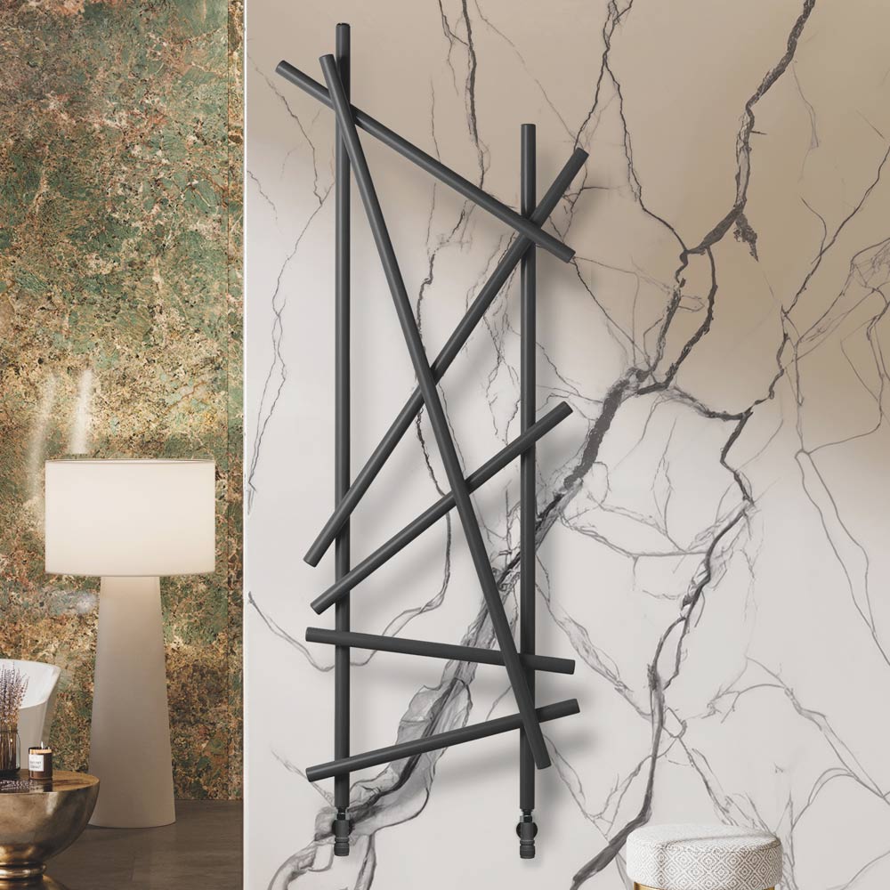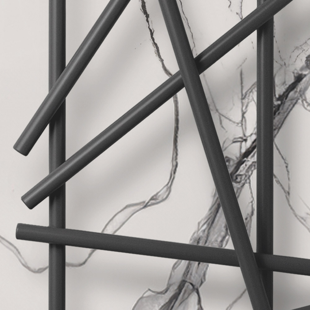 Este radiador de aço se destaca pelo seu design inovador e artístico, ideal para quem procura um elemento funcional com forte impacto estético para o seu ambiente. As linhas irregulares e cruzadas não só maximizam a difusão do calor, mas também transformam o aquecedor em uma verdadeira obra de arte de parede. O acabamento preto fosco dá um toque de modernidade e classe, integrando-se perfeitamente a qualquer esquema de cores e design de interiores, como demonstrado pelas elegantes paredes de mármore e detalhes metálicos do ambiente ao redor.