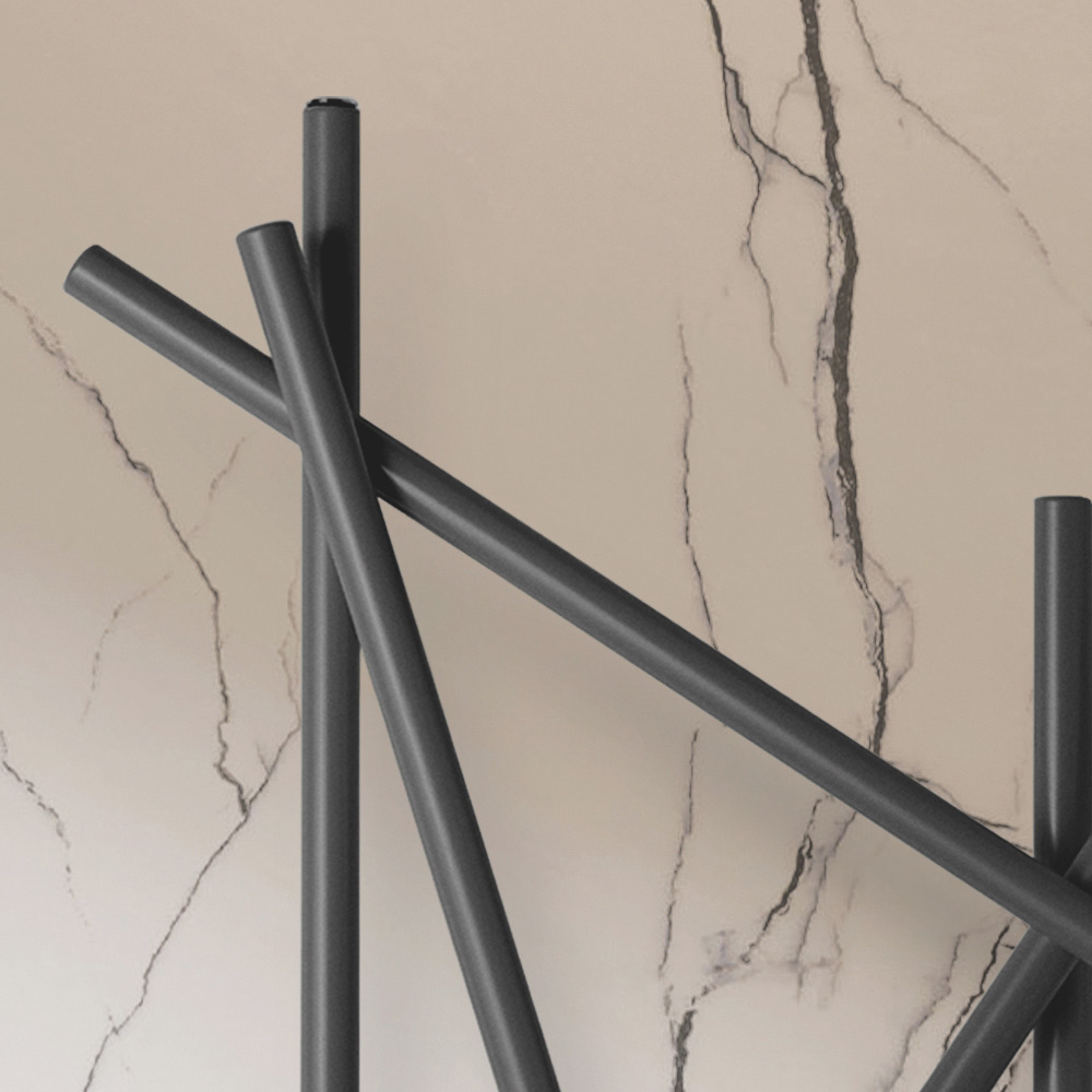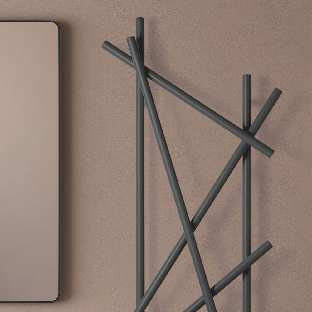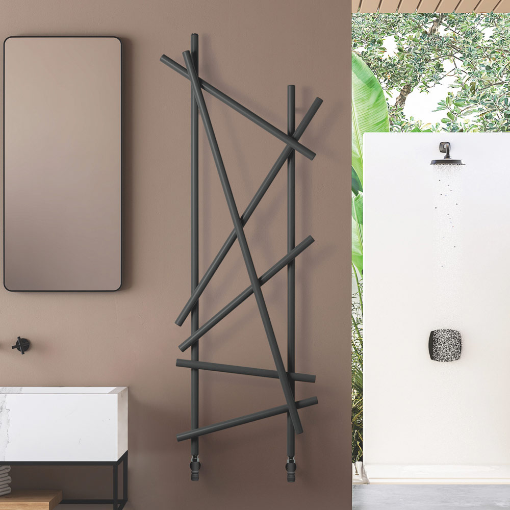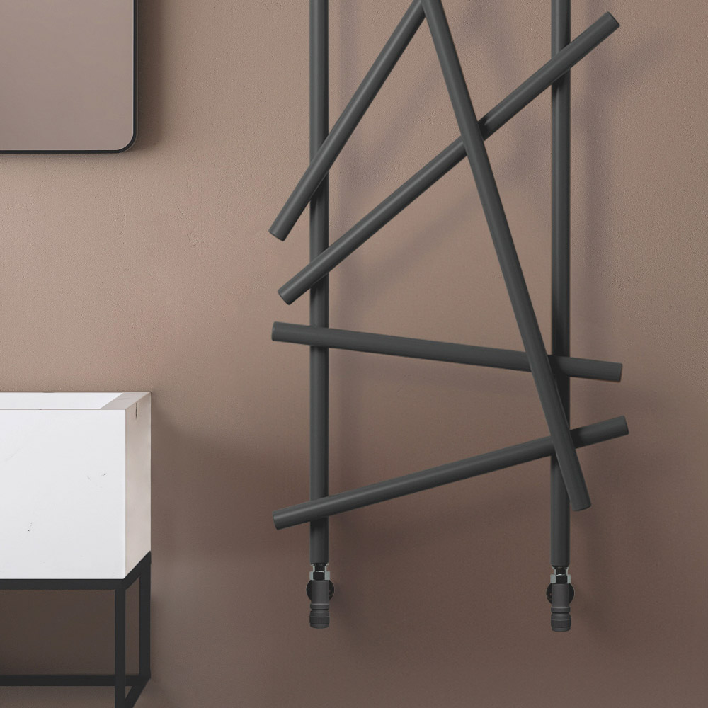 Este radiador de aço se destaca pelo seu design inovador e artístico, ideal para quem procura um elemento funcional com forte impacto estético para o seu ambiente. As linhas irregulares e cruzadas não só maximizam a difusão do calor, mas também transformam o aquecedor em uma verdadeira obra de arte de parede. O acabamento preto fosco dá um toque de modernidade e classe, integrando-se perfeitamente a qualquer esquema de cores e design de interiores, como demonstrado pelas elegantes paredes de mármore e detalhes metálicos do ambiente ao redor.