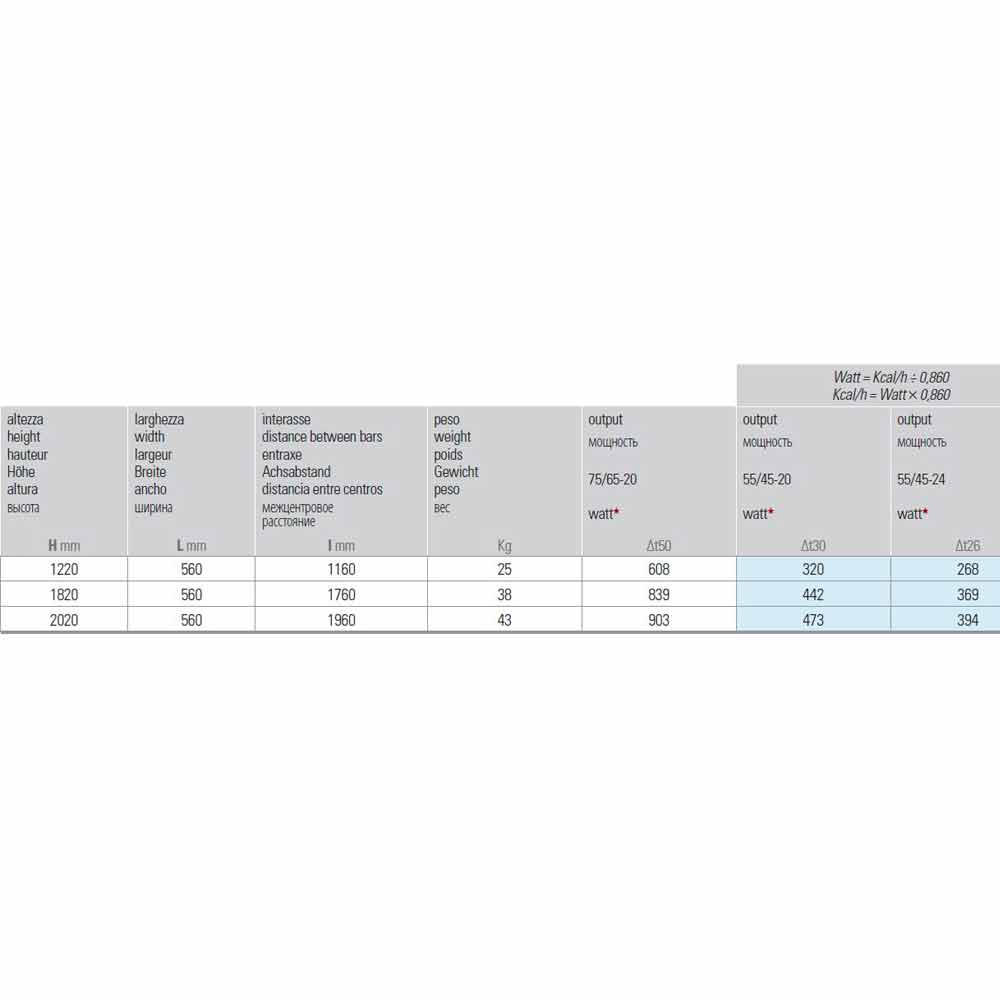 - H 1820 x C 560 x Inter. 1760 mm x Saída w (Δt50 *) 839; Rendimento w (Δt30 *) 442; Rendimento w (Δt26 *) 369