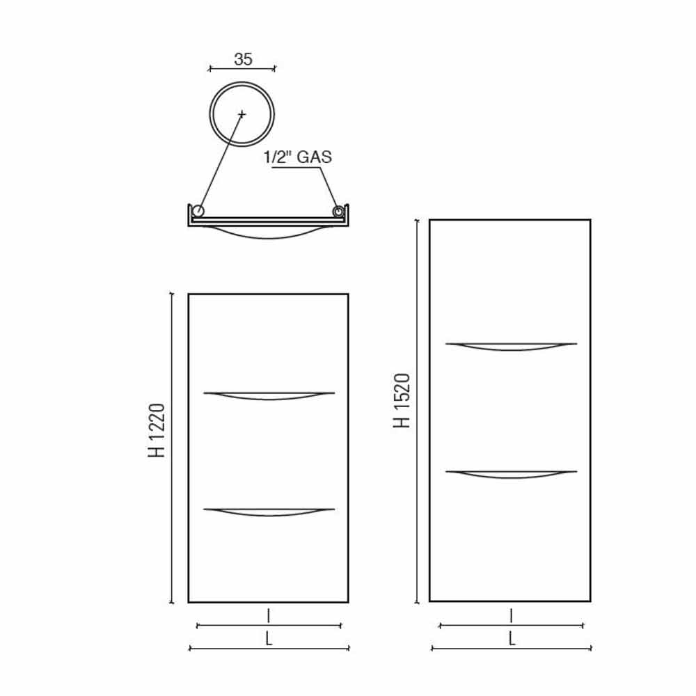 Disponível em diferentes tamanhos *:- H 1220 x C 535 x Inter. 460 x P 63 mm x Saída w (Δt50 *) 475; Rendimento w (Δt30 *) 250; Rendimento w (Δt26 *) 209