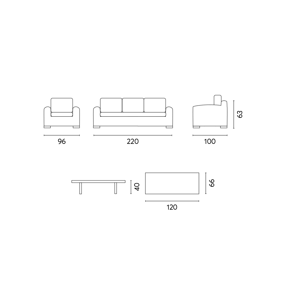 - sofá: L 220 x P 100 x A 63 cm;