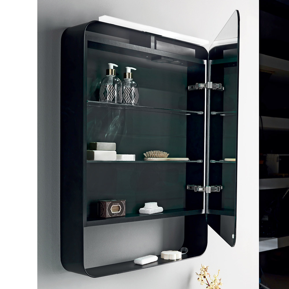 A porta única abre-se para revelar um prático espaço de arrumação, perfeito para manter os seus produtos essenciais de beleza e cuidados arrumados e facilmente acessíveis. A luz LED proporciona uma iluminação ideal, essencial para as rotinas diárias de beleza, ao mesmo tempo que acrescenta um toque moderno.