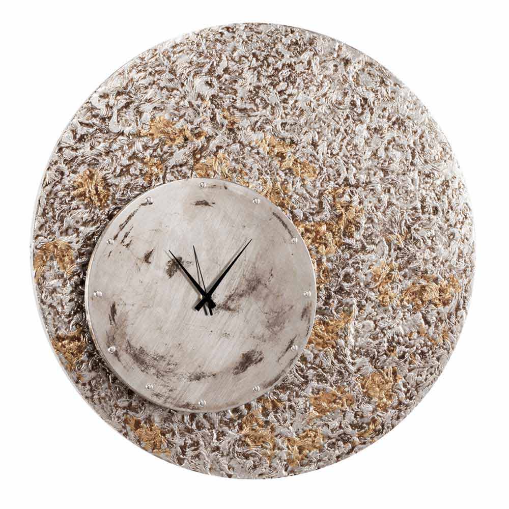 Eccli é um elegante relógio de parede em dois níveis, decorado à mão com folha de ouro e prata em material materico.