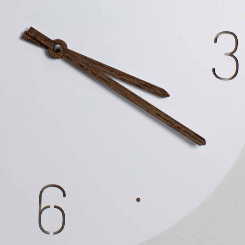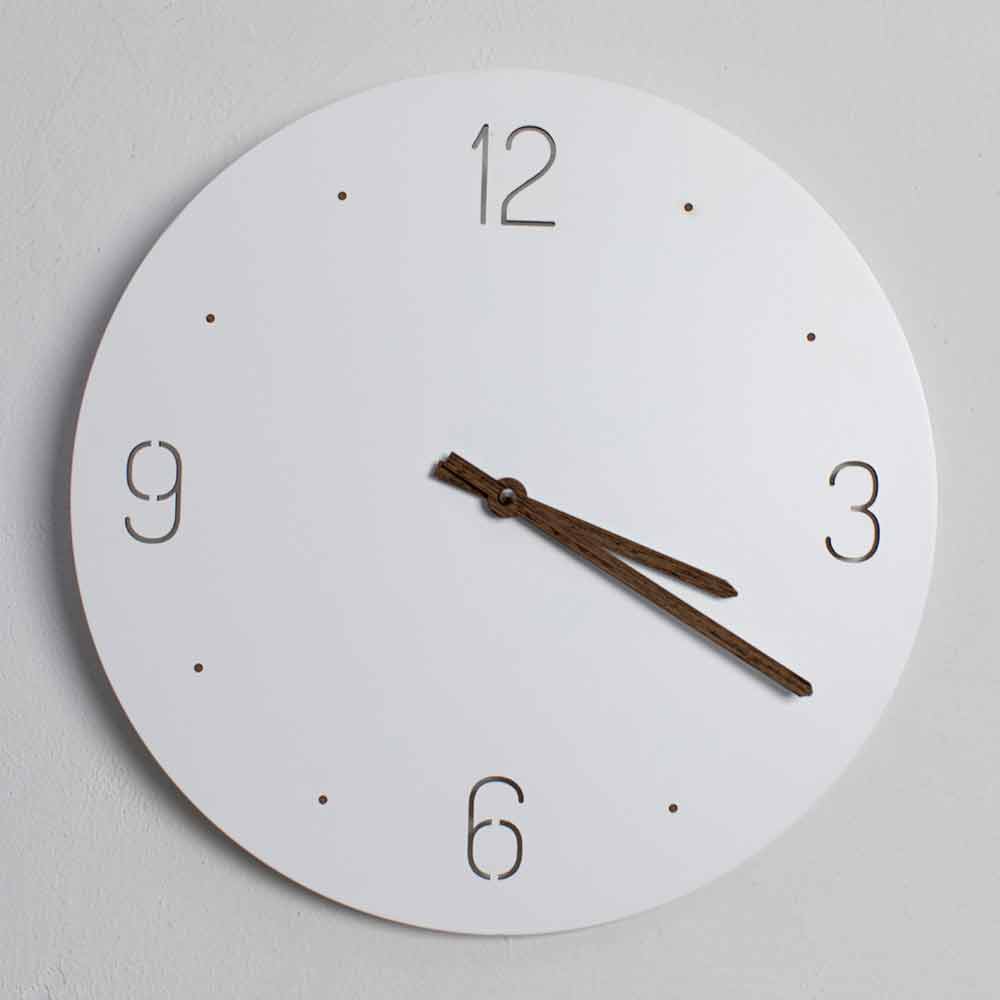 Relógio de parede de design redondo e básico em madeira lacada a branco e cortada a laser, fabricada na Itália.