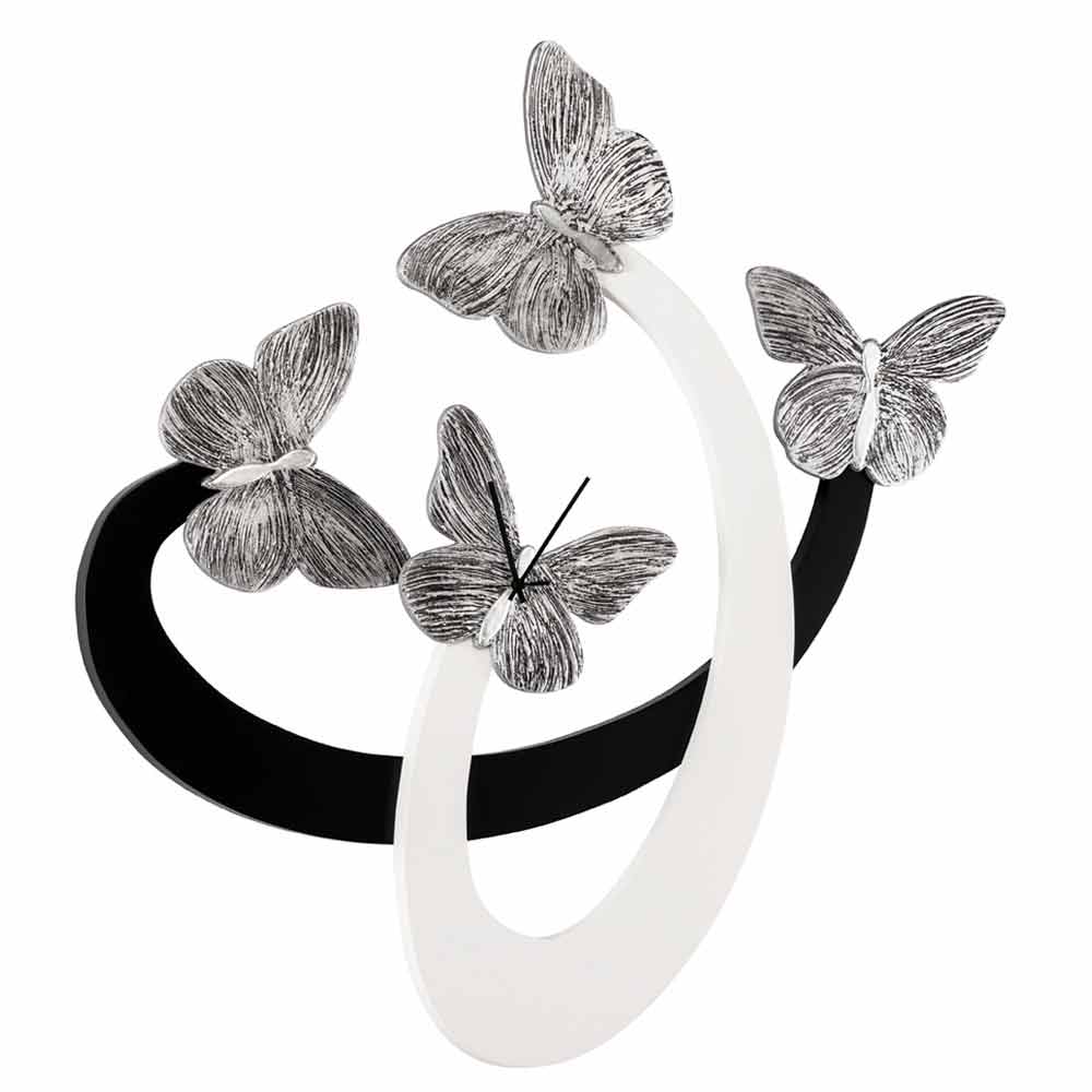 Zenia é um elegante relógio de parede, preto e marfim lacado. É decorado à mão com folha de prata em materico.