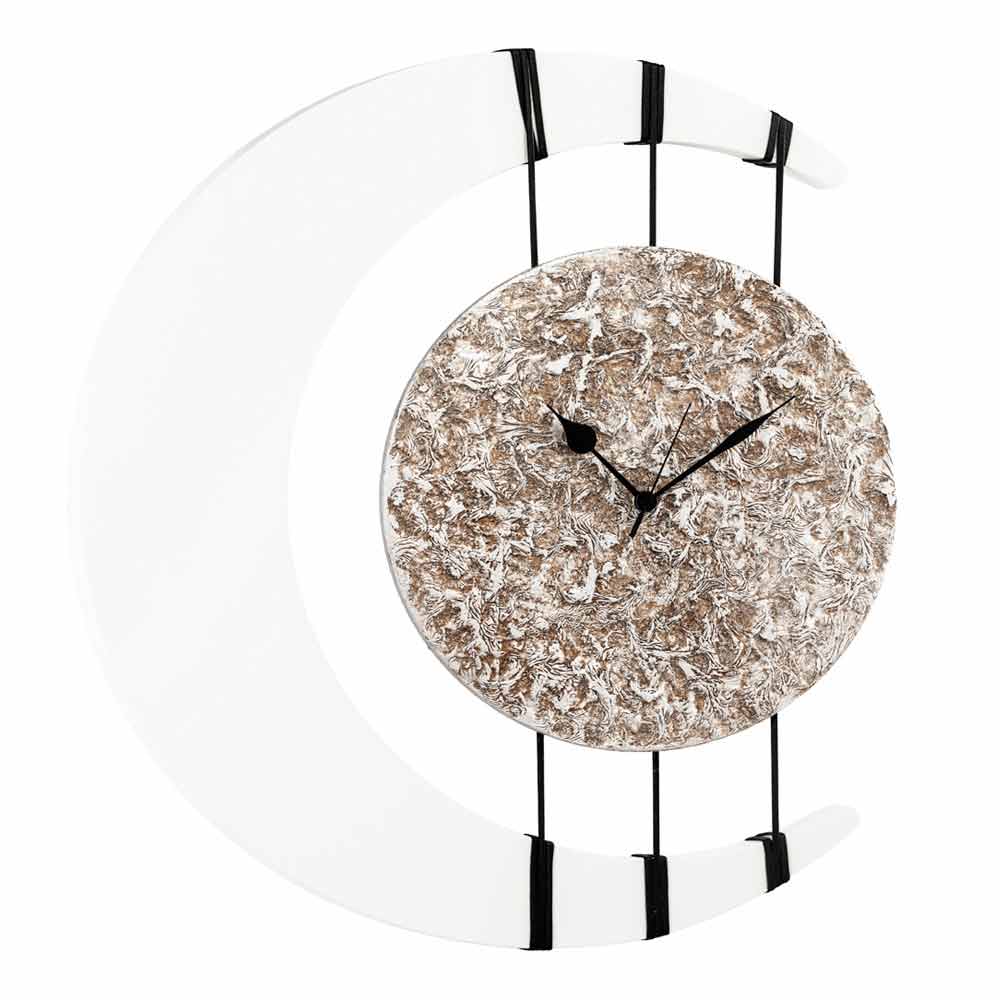 Jilly é um relógio de parede, marfim envernizado com folha de prata em materico, pendurado em cordas.