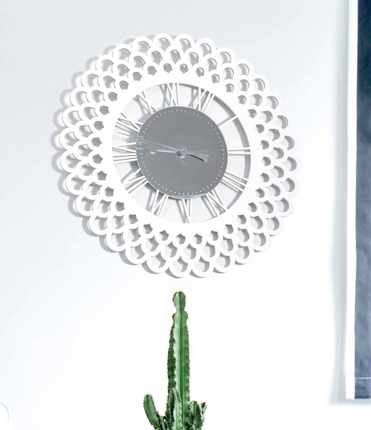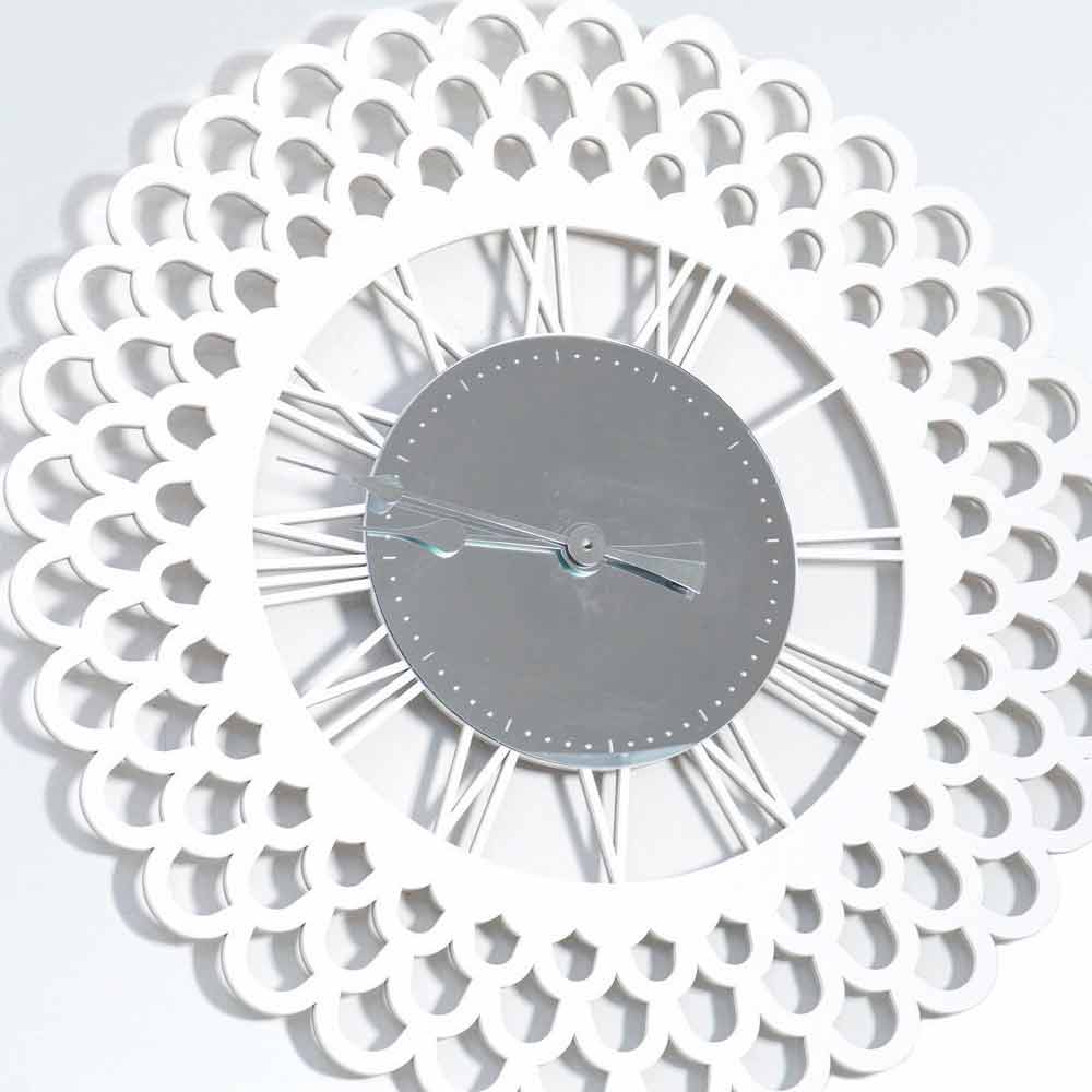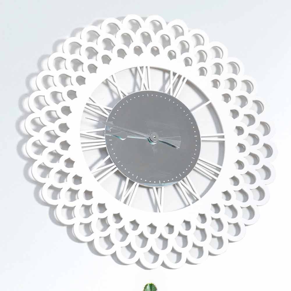 Relógio de parede grande, design moderno em madeira branca com decoração em espelho, forma floral fabricada na Itália.