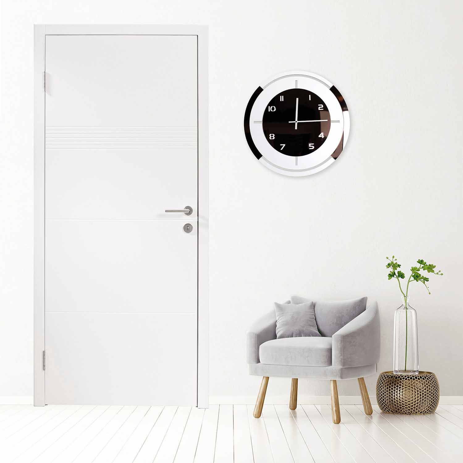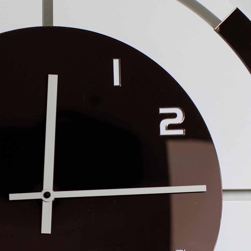 Relógio de parede redondo em madeira lacada branca com decorações em pelxiglass de bronze, design moderno fabricado na Itália.