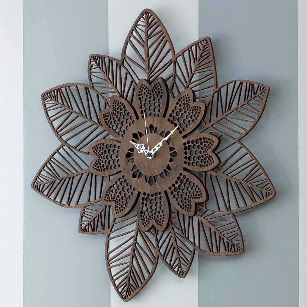 Relógio de parede moderno, design em madeira clara ou wengè, formato floral fabricado na Itália.