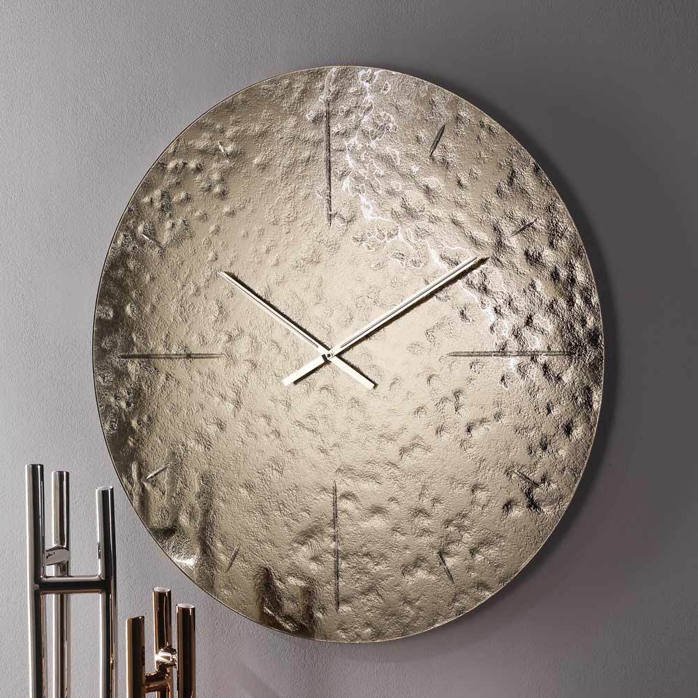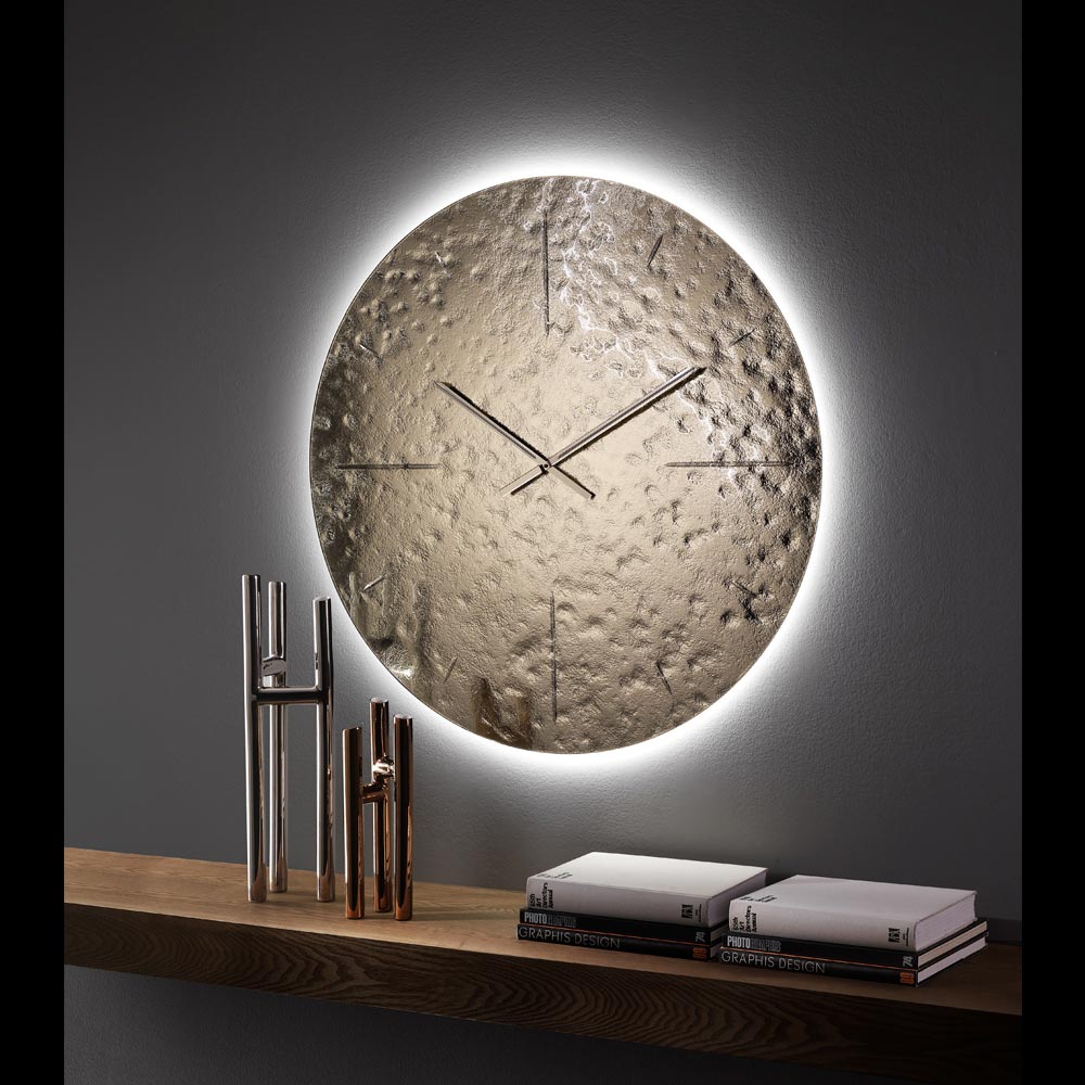 Um relógio de parede com um caráter arrojado e sofisticado, concebido para quem deseja um elemento de decoração exclusivo capaz de valorizar a parede com luz e textura.