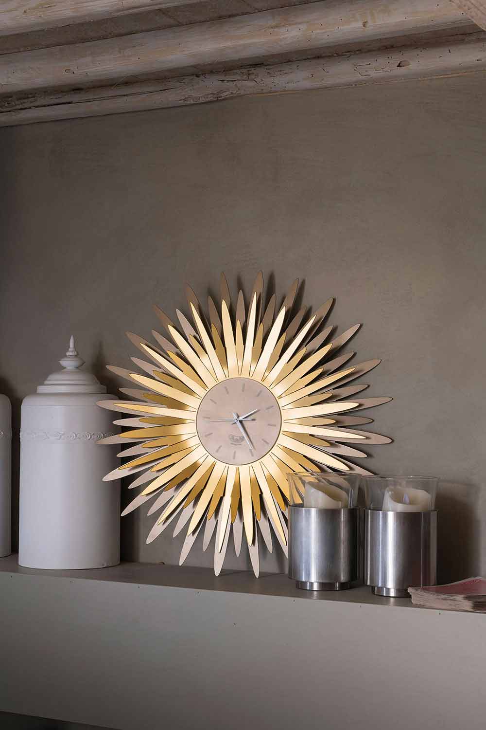 Relógio de design da Itália produzido em bronze e ferro dourado, lama e marfim ou areia e branco.