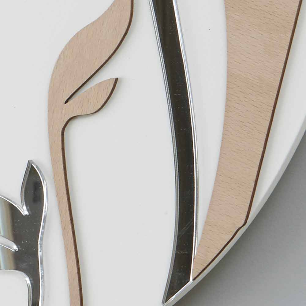 Relógio de parede com desenho redondo em madeira branca com decorações em madeira e plexiglass, moderno e fabricado na Itália.