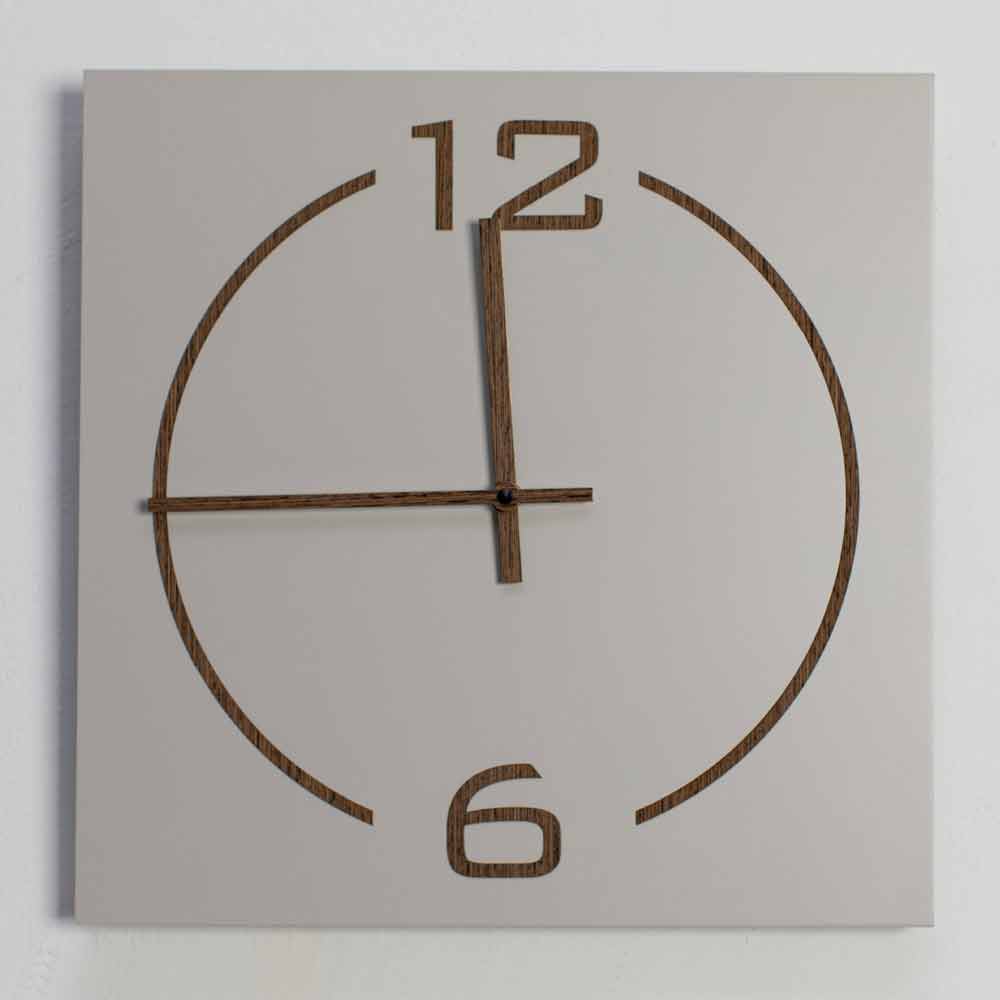 Relógio de parede de design moderno e redondo em decorações e mãos em madeira lacada bege e nogueira, fabricado na Itália.