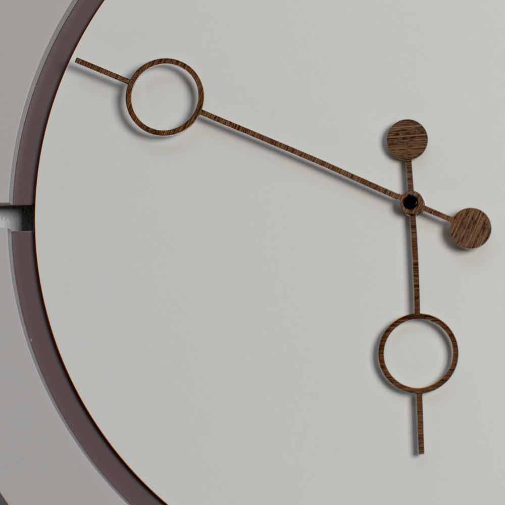 relógio redondo é criado graças à combinação de três tons de marrom: areia, bege e cacau, com ponteiros de nogueira. Cada peça é definida para outra para formar um